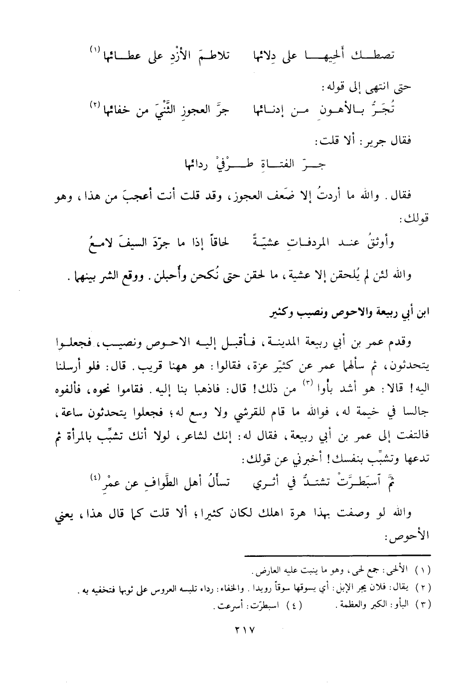 وقدم عمر بن أبي ربيعة المدينة، فأقبل إليه الاحوص ونصيب، فجعلوا يتحدثون، ثم سألهما عمر عن كثيّر عزة، فقالوا: هو ههنا قريب. قال: فلو أرسلنا اليه! قالا: هو أشد بأوا «3» من ذلك! قال: فاذهبا بنا إليه. فقاموا نحوه، فألفوه جالسا في خيمة له، فوالله ما قام للقرشي ولا وسع له، فجعلوا يتحدثون ساعة، فالتفت إلى عمر بن أبي ربيعة، فقال له: إنك لشاعر، لولا أنك تشبّب بالمرأة ثم تدعها وتشبّب بنفسك! أخبرني عن قولك:
