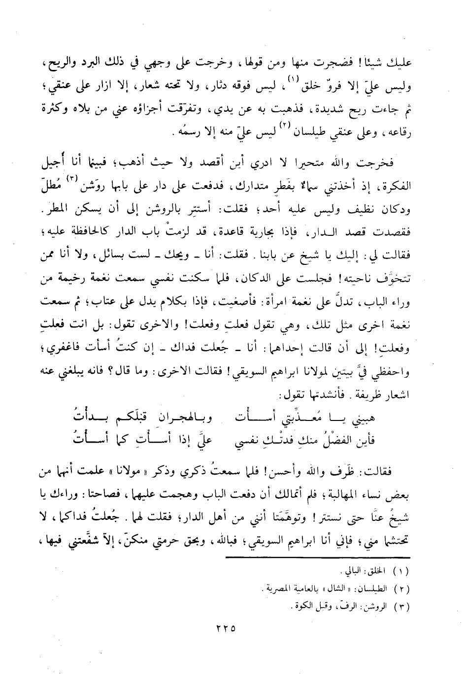 فقالت: ظرف والله وأحسن! فلما سمعت ذكري وذكر «مولانا» علمت أنهما من بعض نساء المهالبة؛ فلم أتمالك أن دفعت الباب وهجمت عليهما، فصاحتا: وراءك يا شيخ عنّا حتى نستتر! وتوهّمتا أنني من أهل الدار؛ فقلت لهما. جعلت فداكما، لا تحتشما مني؛ فإني أنا ابراهيم السويقي؛ فبالله، وبحق حرمتي منكنّ، إلّا شفّعتني فيها،