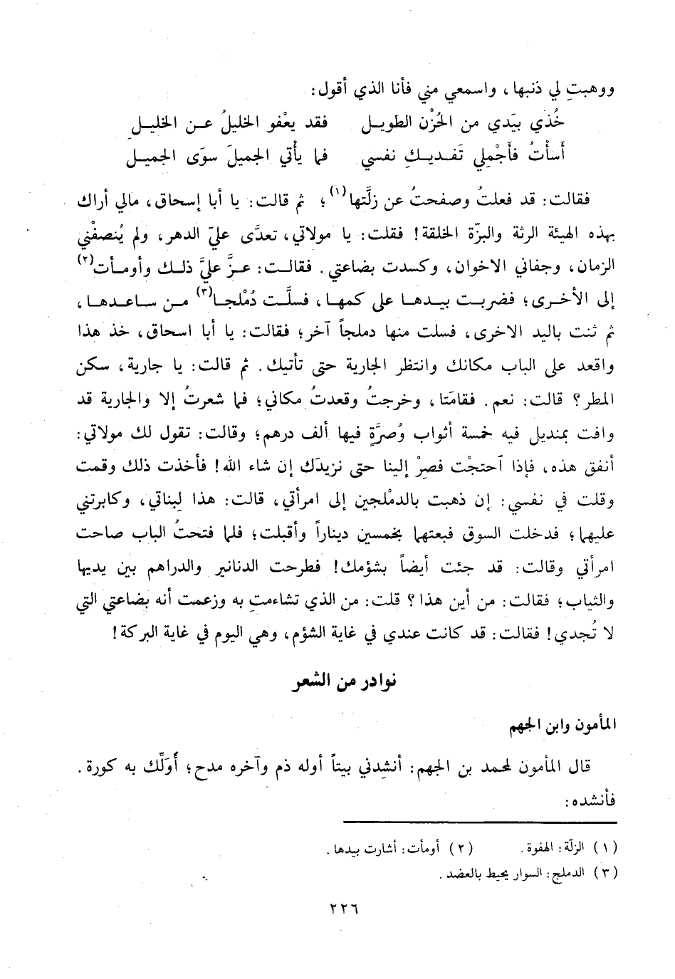 فقالت: قد فعلت وصفحت عن زلّتها «1» ؛ ثم قالت: يا أبا إسحاق، مالي أراك بهذه الهيئة الرثة والبزّة الخلقة! فقلت: يا مولاتي، تعدّى عليّ الدهر، ولم ينصفني الزمان، وجفاني الاخوان، وكسدت بضاعتي. فقالت: عزّ عليّ ذلك وأومأت «2» إلى الأخرى؛ فضربت بيدها على كمها، فسلّت دملجا «3» من ساعدها، ثم ثنت باليد الاخرى، فسلت منها دملجا آخر؛ فقالت: يا أبا اسحاق، خذ هذا واقعد على الباب مكانك وانتظر الجارية حتى تأتيك. ثم قالت: يا جارية، سكن المطر؟ قالت: نعم. فقامتا، وخرجت وقعدت مكاني؛ فما شعرت إلا والجارية قد وافت بمنديل فيه خمسة أثواب وصرّة فيها ألف درهم؛ وقالت: تقول لك مولاتي: