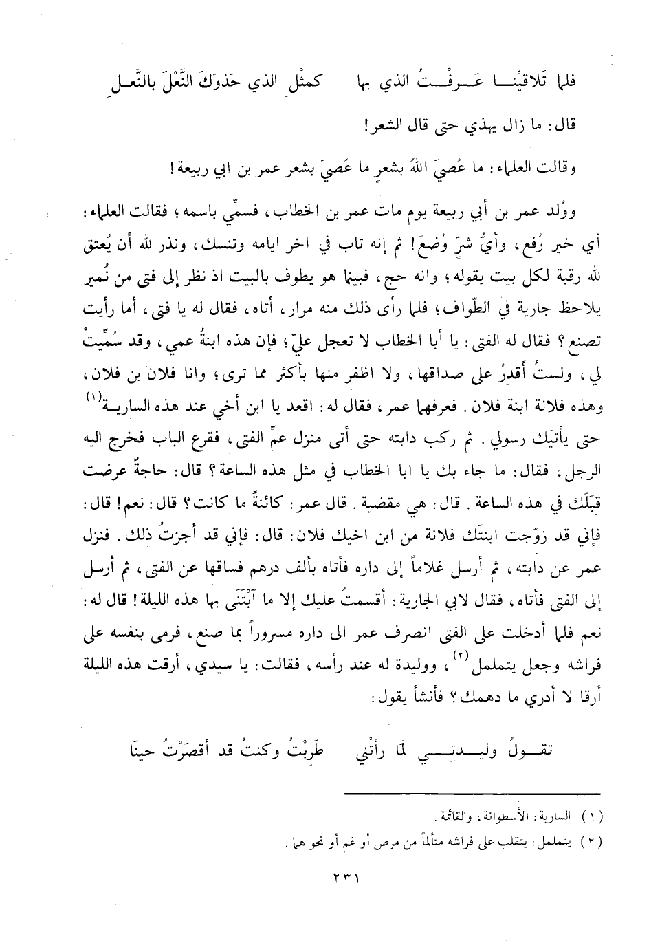 نعم فلما أدخلت على الفتى انصرف عمر الى داره مسرورا بما صنع، فرمى بنفسه على فراشه وجعل يتململ «2» ، ووليدة له عند رأسه، فقالت: يا سيدي، أرقت هذه الليلة أرقا لا أدري ما دهمك؟ فأنشأ يقول: