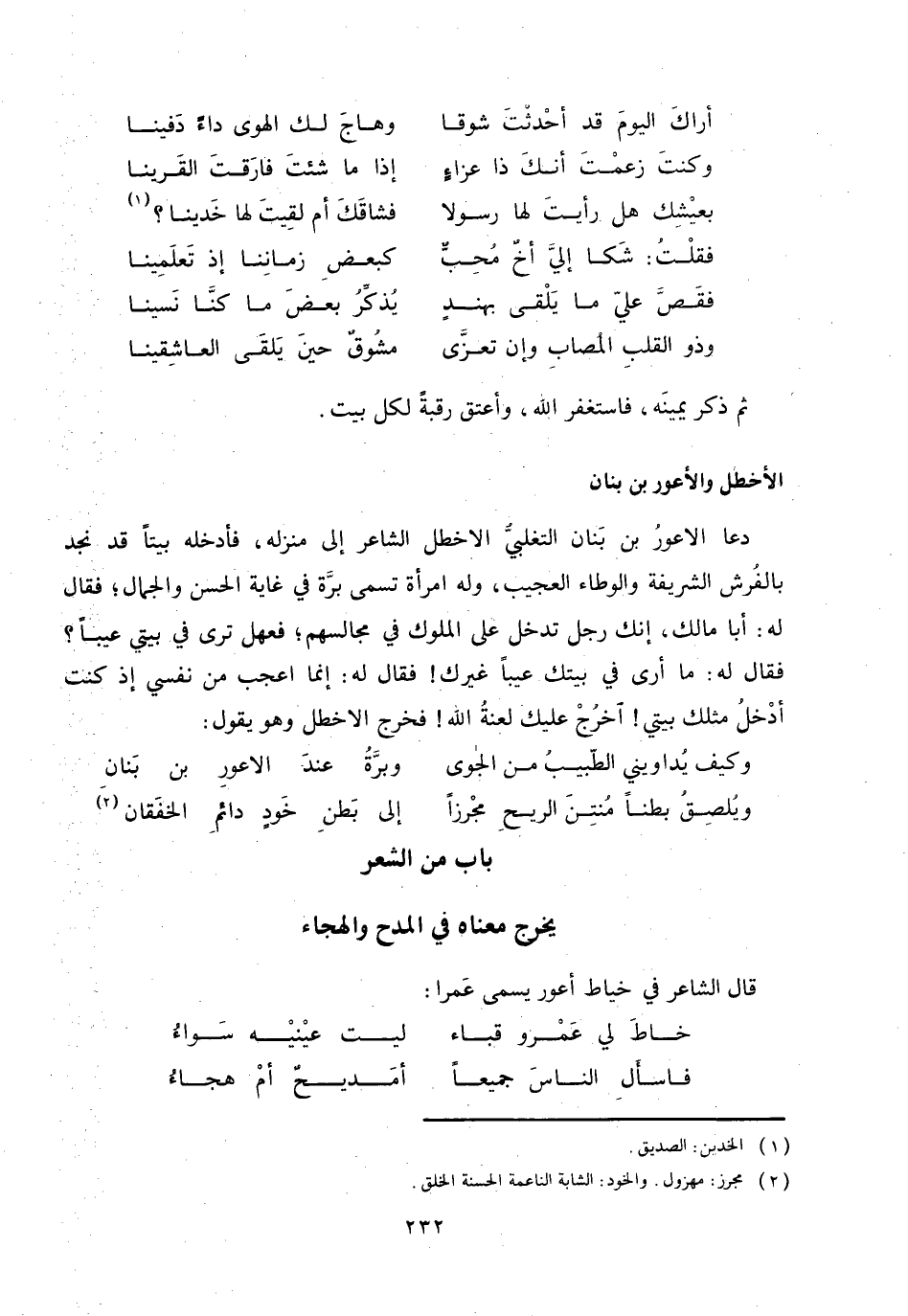 دعا الاعور بن بنان التغلبيّ الاخطل الشاعر إلى منزله، فأدخله بيتا قد نجد بالفرش الشريفة والوطاء العجيب، وله امرأة تسمى برّة في غاية الحسن والجمال؛ فقال له: أبا مالك، إنك رجل تدخل على الملوك في مجالسهم؛ فعهل ترى في بيتي عيبا؟