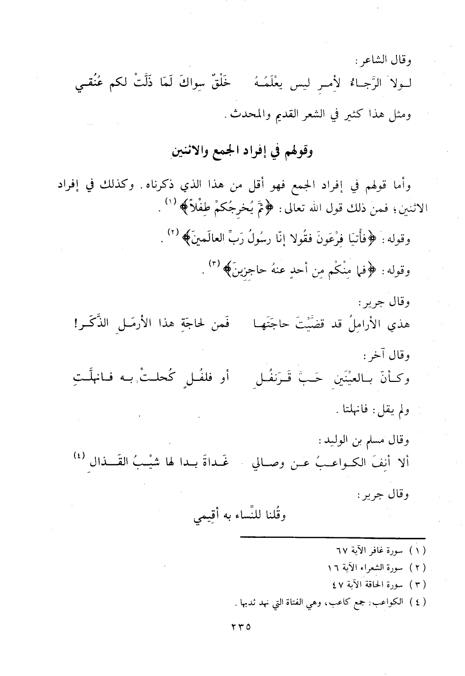 وأما قولهم في إفراد الجمع فهو أقل من هذا الذي ذكرناه. وكذلك في إفراد الاثنين؛ فمن ذلك قول الله تعالى: ثُمَّ يُخْرِجُكُمْ طِفْلًا