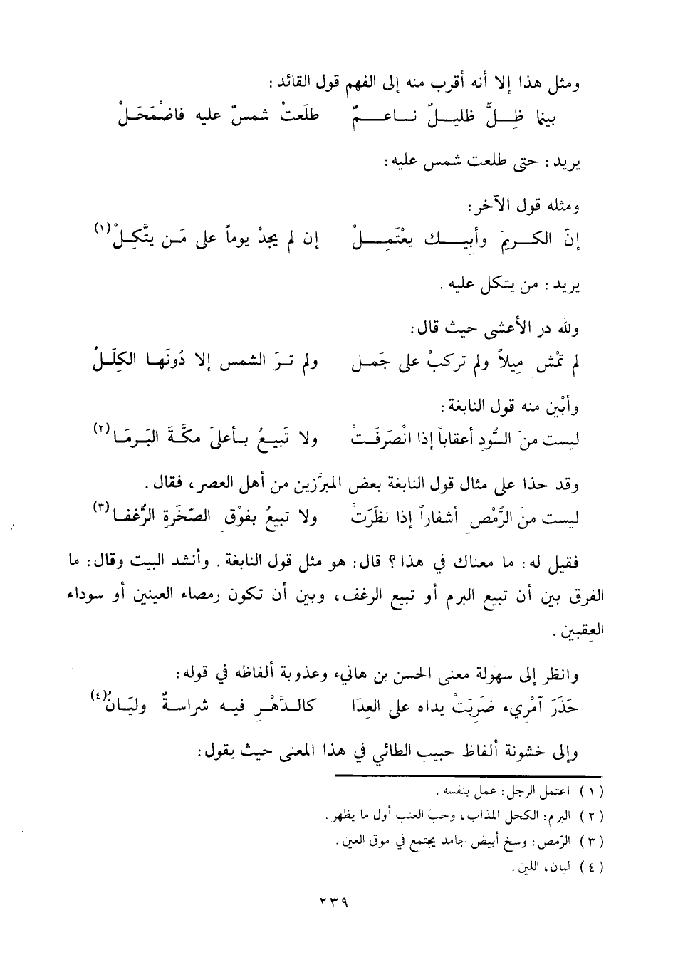 فقيل له: ما معناك في هذا؟ قال: هو مثل قول النابغة. وأنشد البيت وقال: ما الفرق بين أن تبيع البرم أو تبيع الرغف، وبين أن تكون رمصاء العينين أو سوداء العقبين.