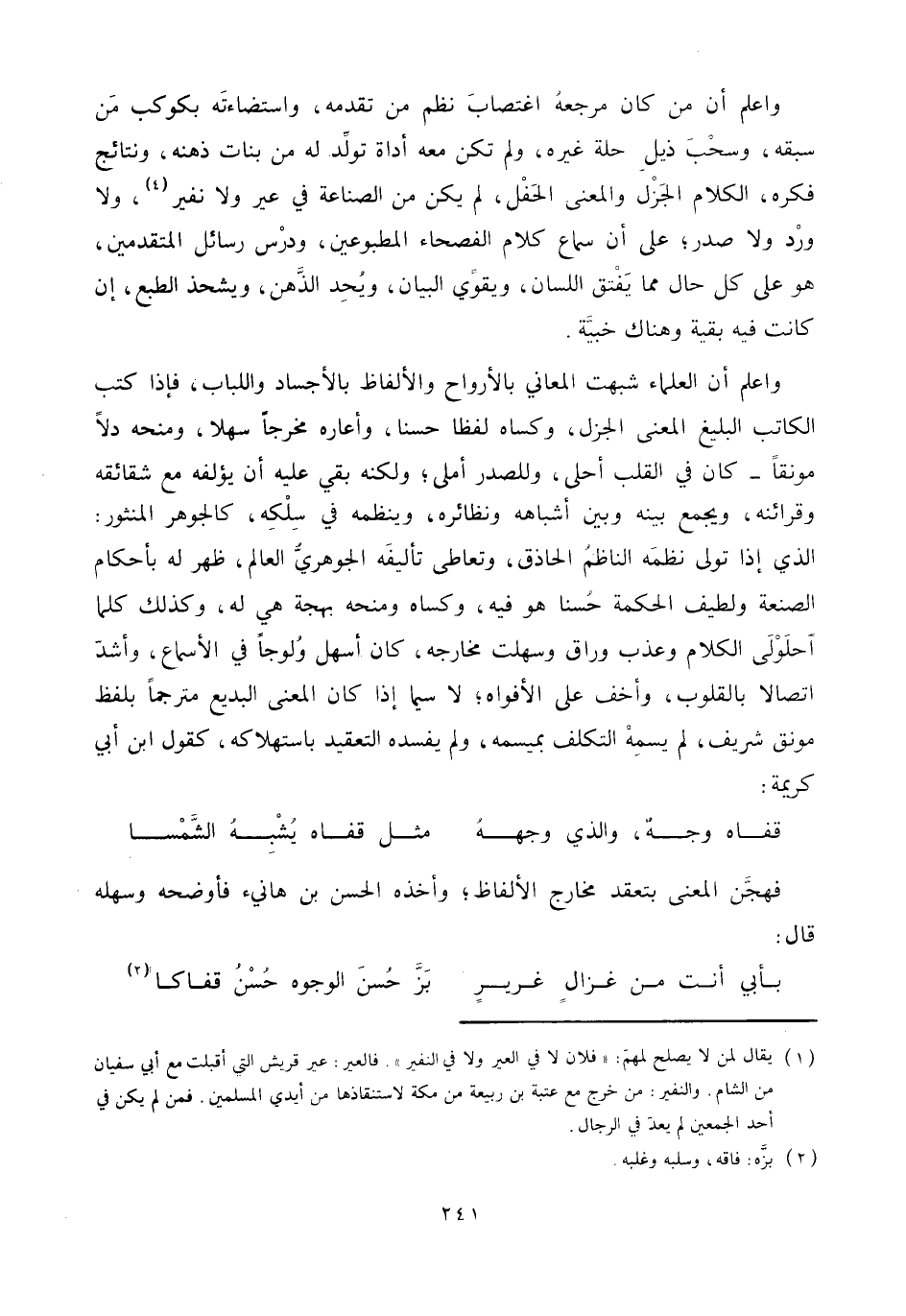 واعلم أن من كان مرجعه اغتصاب نظم من تقدمه، واستضاءته بكوكب من سبقه، وسحب ذيل حلة غيره، ولم تكن معه أداة تولّد له من بنات ذهنه، ونتائج فكره، الكلام الجزل والمعنى الحفل، لم يكن من الصناعة في عير ولا نفير «1» ، ولا ورد ولا صدر؛ على أن سماع كلام الفصحاء المطبوعين، ودرس رسائل المتقدمين، هو على كل حال مما يفتق اللسان، ويقوي البيان، ويحد الذّهن، ويشحذ الطبع، إن كانت فيه بقية وهناك خبيّة.