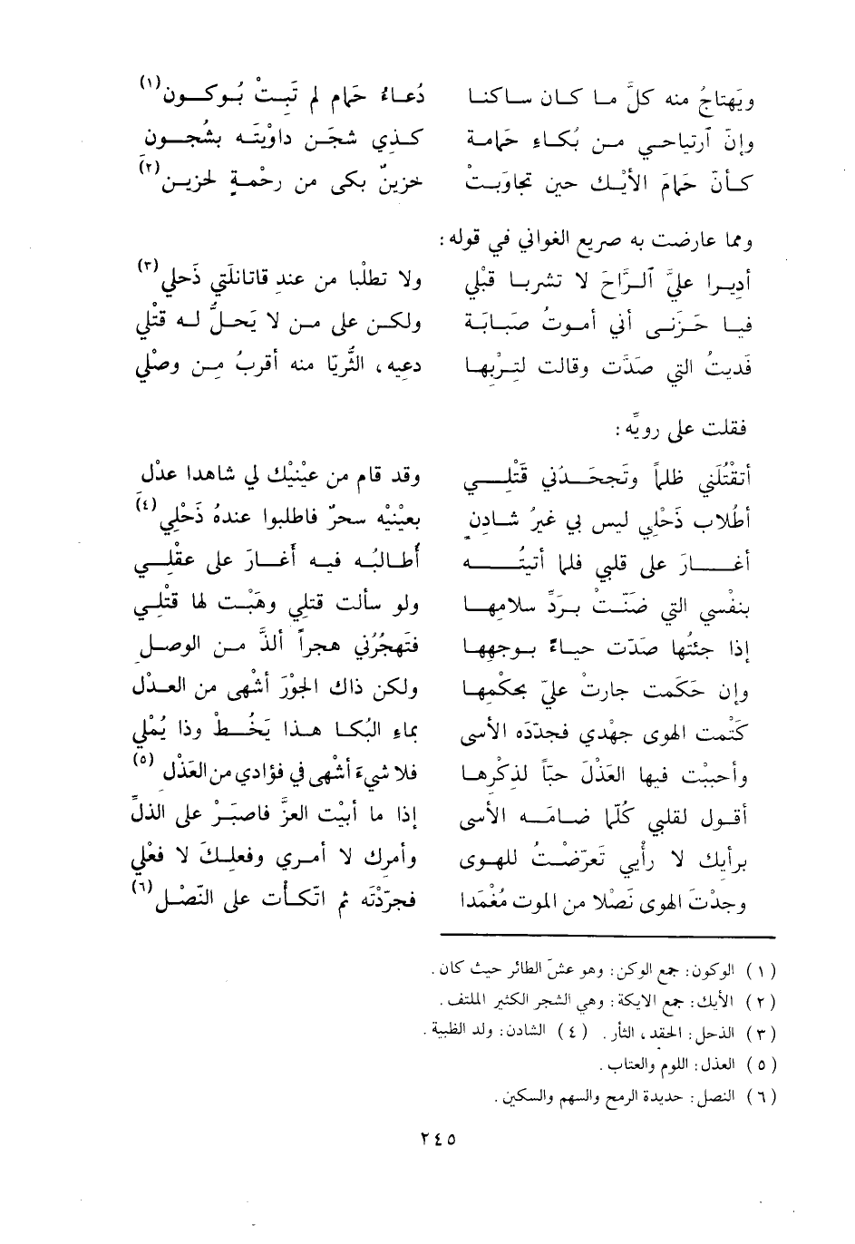 كأنّ حمام الأيك حين تجاوبت ... خزين بكى من رحمة لحزين «2»