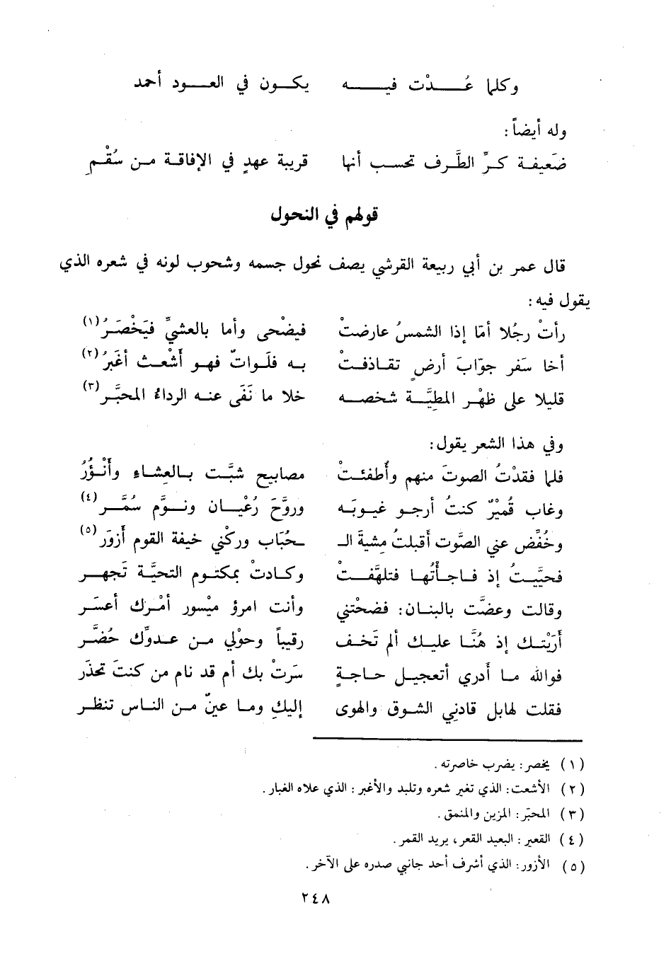 قال عمر بن أبي ربيعة القرشي يصف نحول جسمه وشحوب لونه في شعره الذي يقول فيه: