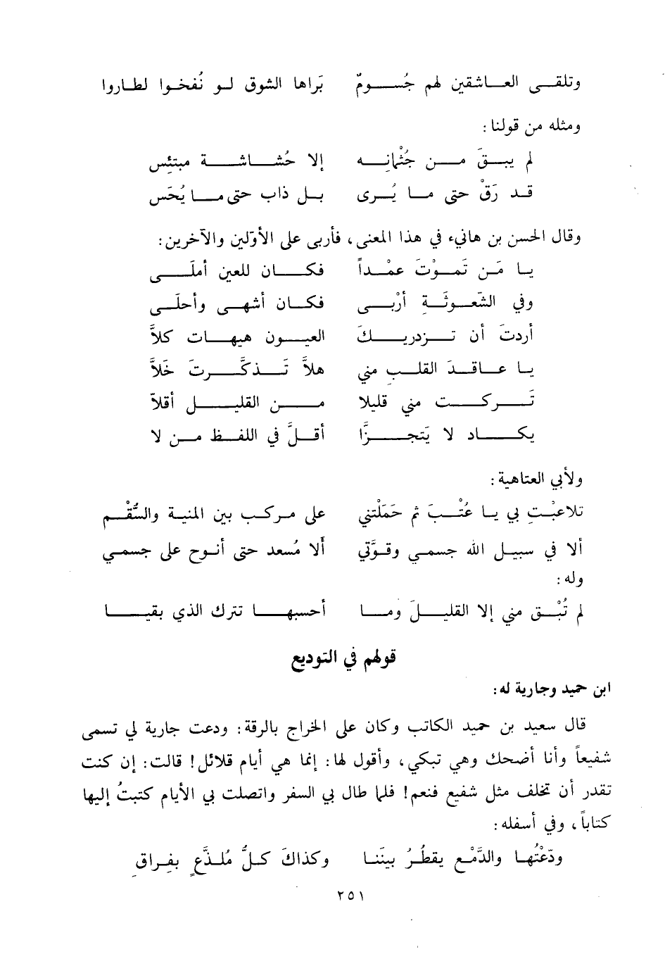 قال سعيد بن حميد الكاتب وكان على الخراج بالرقة: ودعت جارية لي تسمى شفيعا وأنا أضحك وهي تبكي، وأقول لها: إنما هي أيام قلائل! قالت: إن كنت تقدر أن تخلف مثل شفيع فنعم! فلما طال بي السفر واتصلت بي الأيام كتبت إليها كتابا، وفي أسفله: