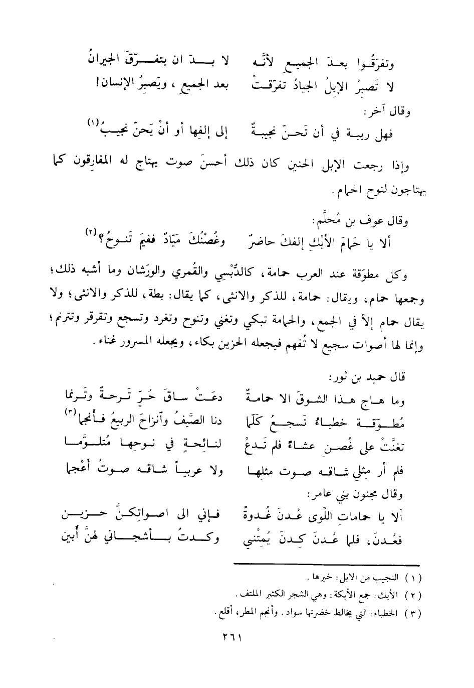وإذا رجعت الإبل الحنين كان ذلك أحسن صوت يهتاج له المفارقون كما يهتاجون لنوح الحمام.