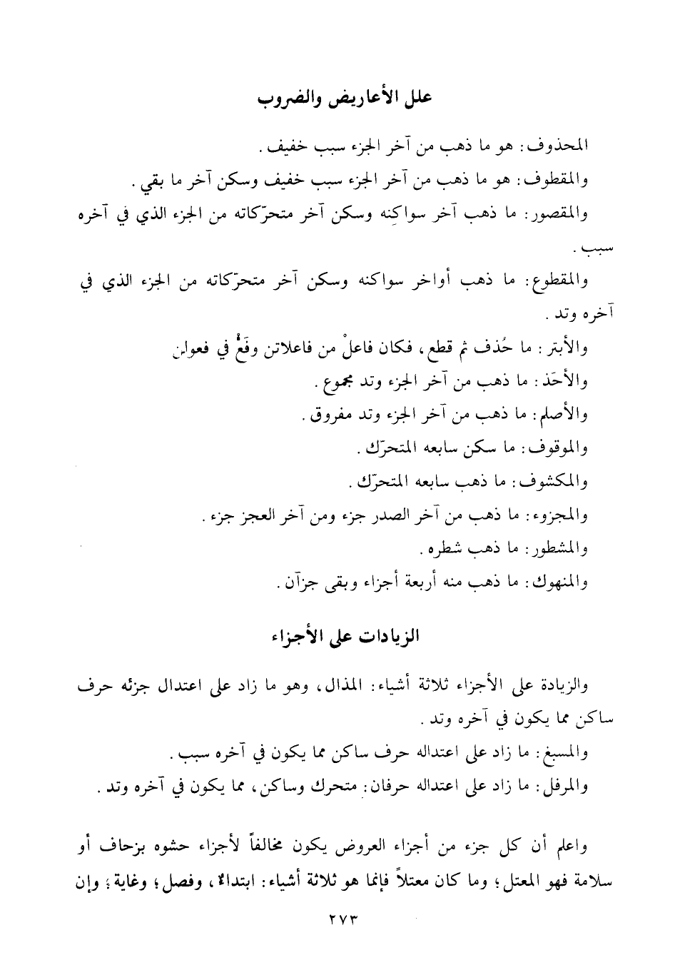 واعلم أن كل جزء من أجزاء العروض يكون مخالفا لأجزاء حشوه بزحاف أو سلامة فهو المعتل؛ وما كان معتلا فإنما هو ثلاثة أشياء: ابتداء، وفصل؛ وغاية؛ وإن