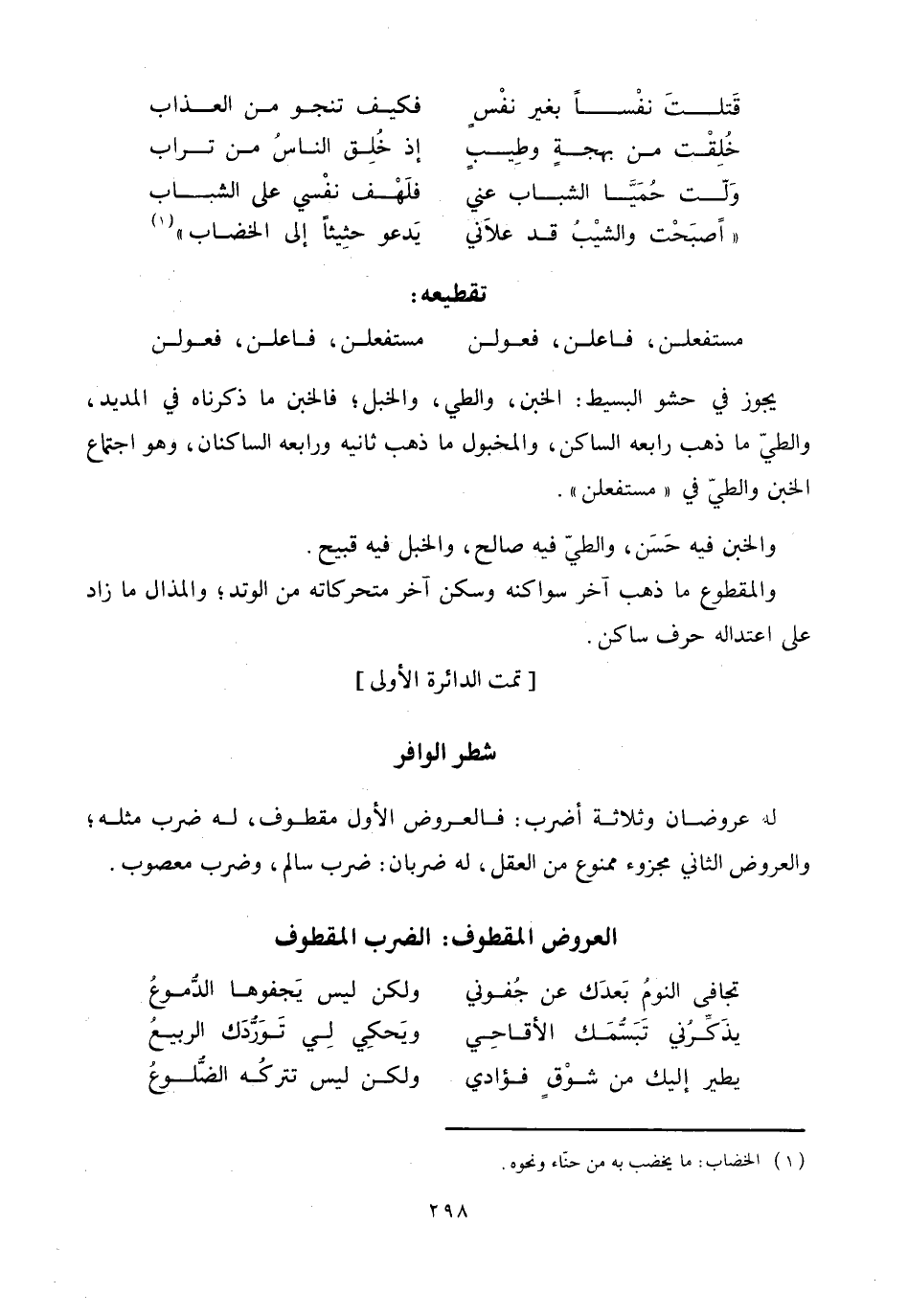 له عروضان وثلاثة أضرب: فالعروض الأول مقطوف، له ضرب مثله، والعروض الثاني مجزوء ممنوع من العقل، له ضربان: ضرب سالم، وضرب معصوب.