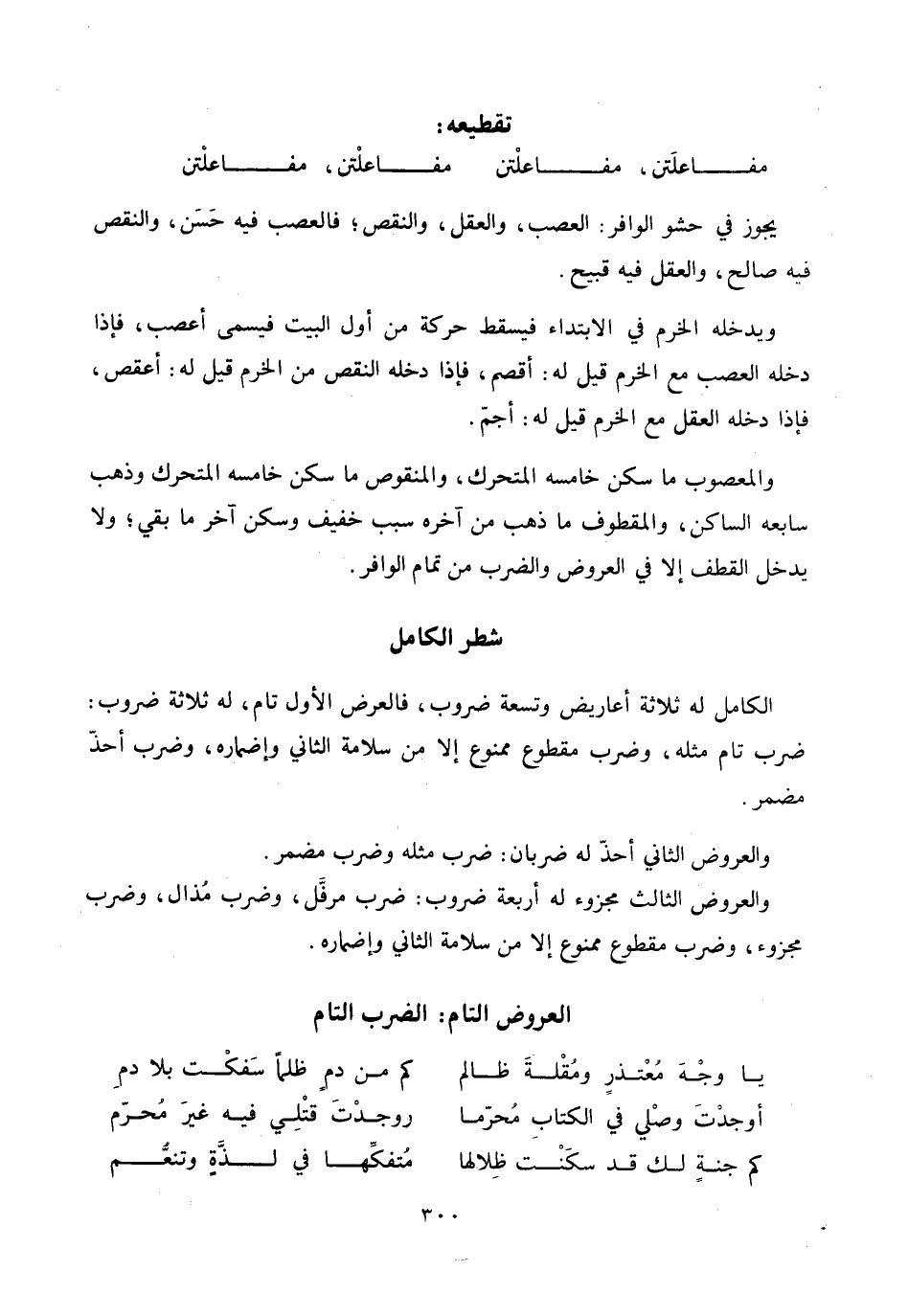 الكامل له ثلاثة أعاريض وتسعة ضروب، فالعرض الأول تام، له ثلاثة ضروب: