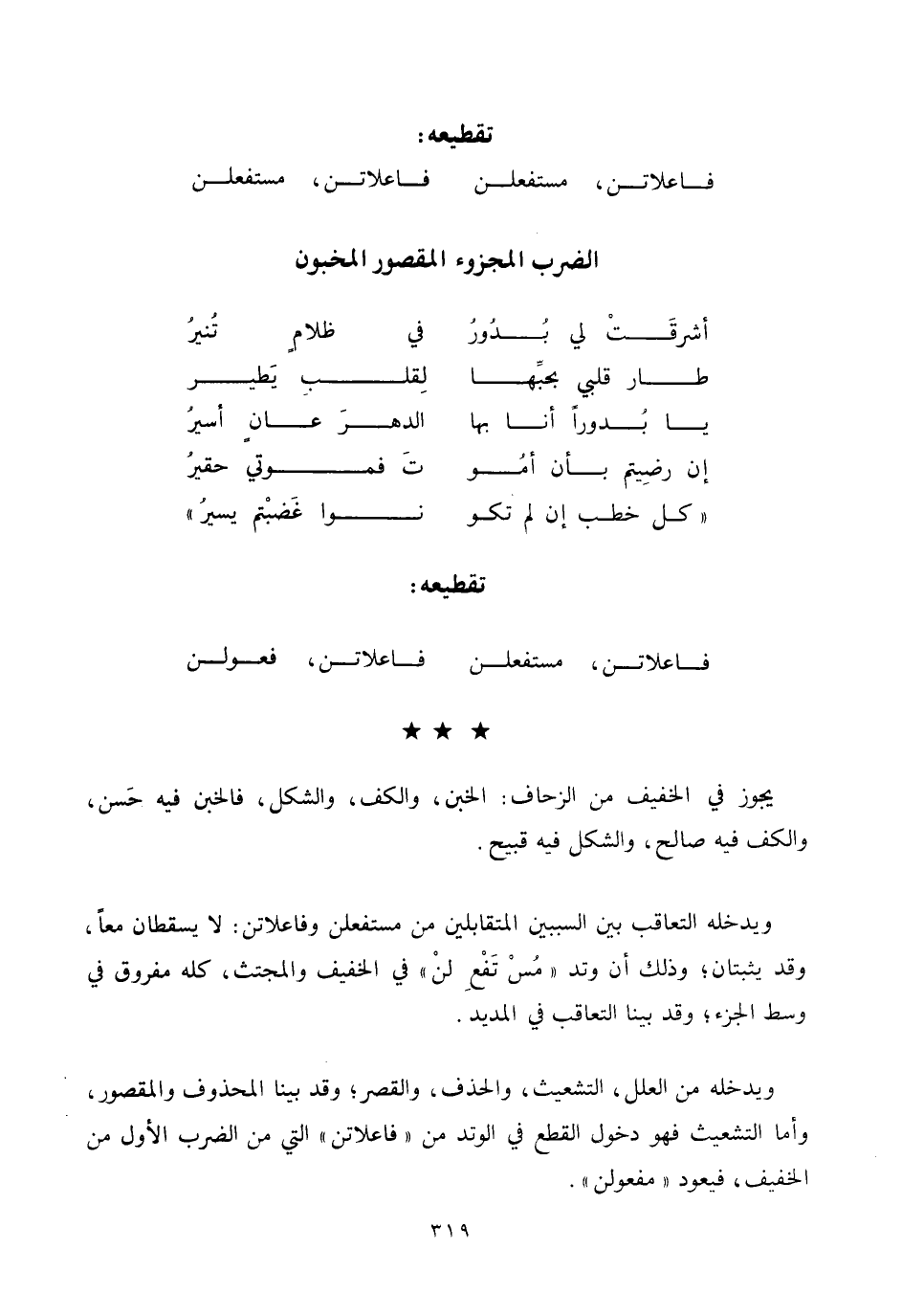ويدخله من العلل، التشعيث، والحذف، والقصر، وقد بينا المحذوف والمقصور، وأما التشعيث فهو دخول القطع في الوتد من «فاعلاتن» التي من الضرب الأول من الخفيف، فيعود «مفعولن» .