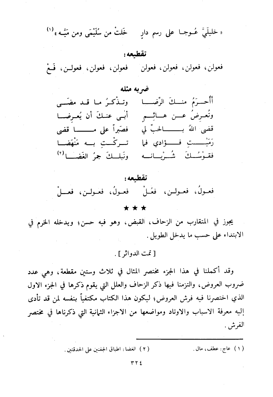 وقد أكملنا في هذا الجزء مختصر المثال في ثلاث وستين مقطعة، وهي عدد ضروب العروض، والتزمنا فيها ذكر الزحاف والعلل التي يقوم ذكرها في الجزء الاول الذي اختصرنا فيه فرش العروض، ليكون هذا الكتاب مكتفيا بنفسه لمن قد تأدى إليه معرفة الاسباب والاوتاد ومواضعها من الاجزاء الثمانية التي ذكرناها في مختصر الفرش.