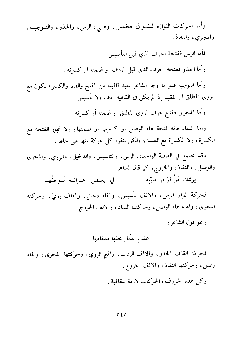 عفت الدّيار محلّها فمقامها فحركة القاف الحذو، والالف الردف، والميم الرويّ: وحركتها المجرى، والهاء وصل، وحركتها النفاذ، والالف الخروج.