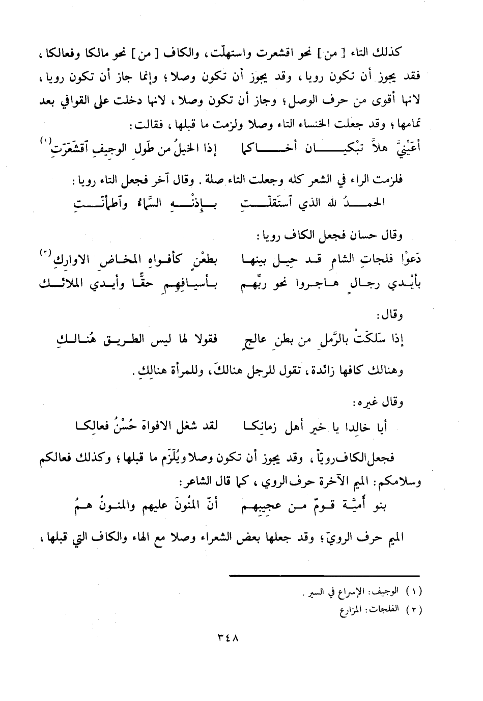 كذلك التاء [من] نحو اقشعرت واستهلّت، والكاف [من] نحو مالكا وفعالكا، فقد يجوز أن تكون رويا، وقد يجوز أن تكون وصلا، وإنما جاز أن تكون رويا، لانها أقوى من حرف الوصل، وجاز أن تكون وصلا، لانها دخلت على القوافي بعد تمامها، وقد جعلت الخنساء التاء وصلا ولزمت ما قبلها، فقالت: