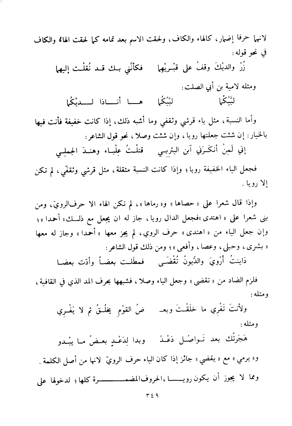 وإذا قال شعرا على «حصاها» و «رماها» ، لم تكن الهاء الا حرف الرويّ، ومن بنى شعرا على «اهتدى» فجعل الدال رويا، جاز له ان يجعل مع ذلك «أحمدا» ، وإن جعل الياء من «اهتدى» حرف الروي، لم يجز معها «أحمدا» وجاز له معها «بشرى، وحبلى، وعصا، وأفعى» ، ومن ذلك قول الشاعر: