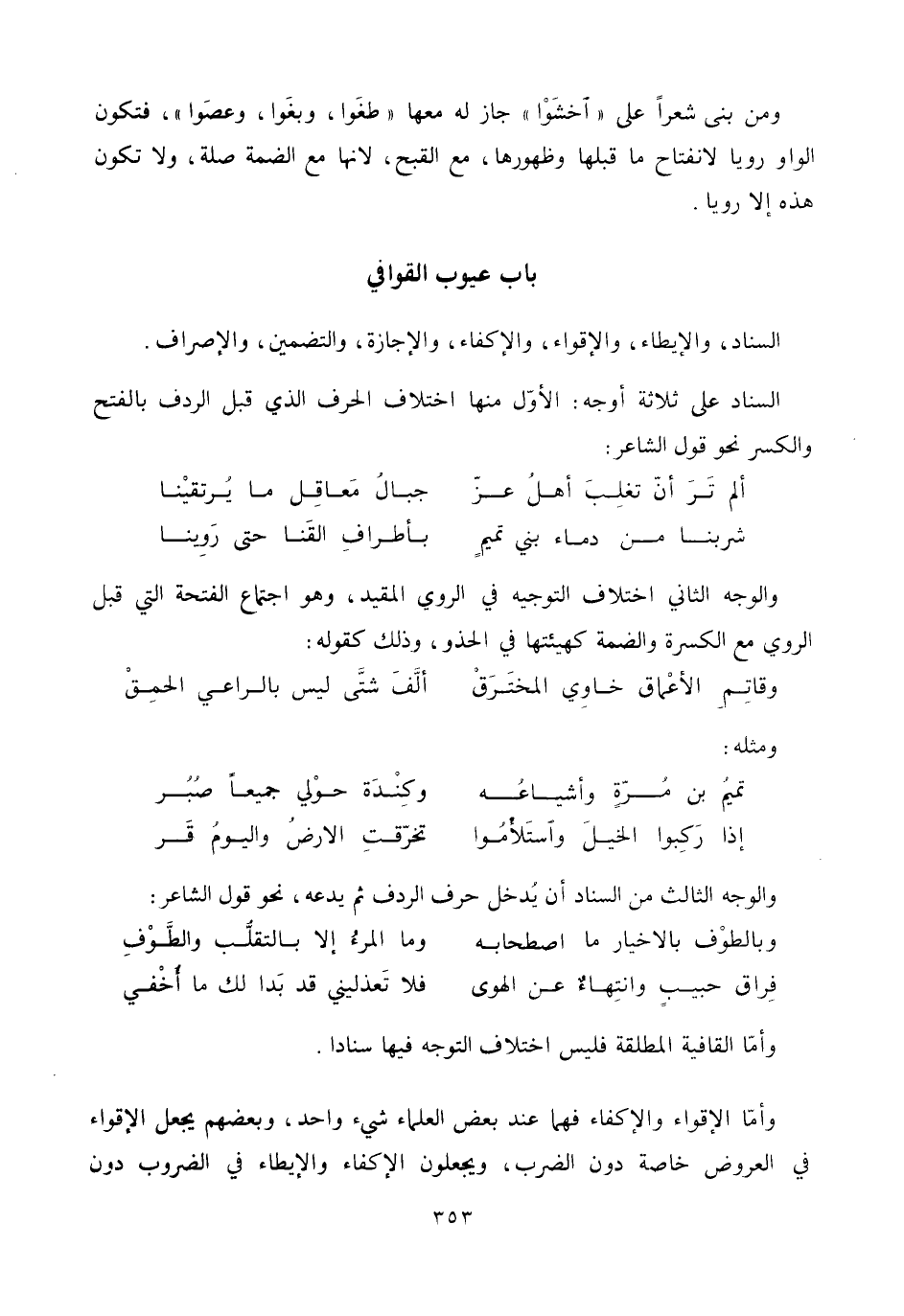 ومن بنى شعرا على «اخشوا» جاز له معها «طغوا، وبغوا، وعصوا» ، فتكون الواو رويا لانفتاح ما قبلها وظهورها، مع القبح، لانها مع الضمة صلة، ولا تكون هذه إلا رويا.