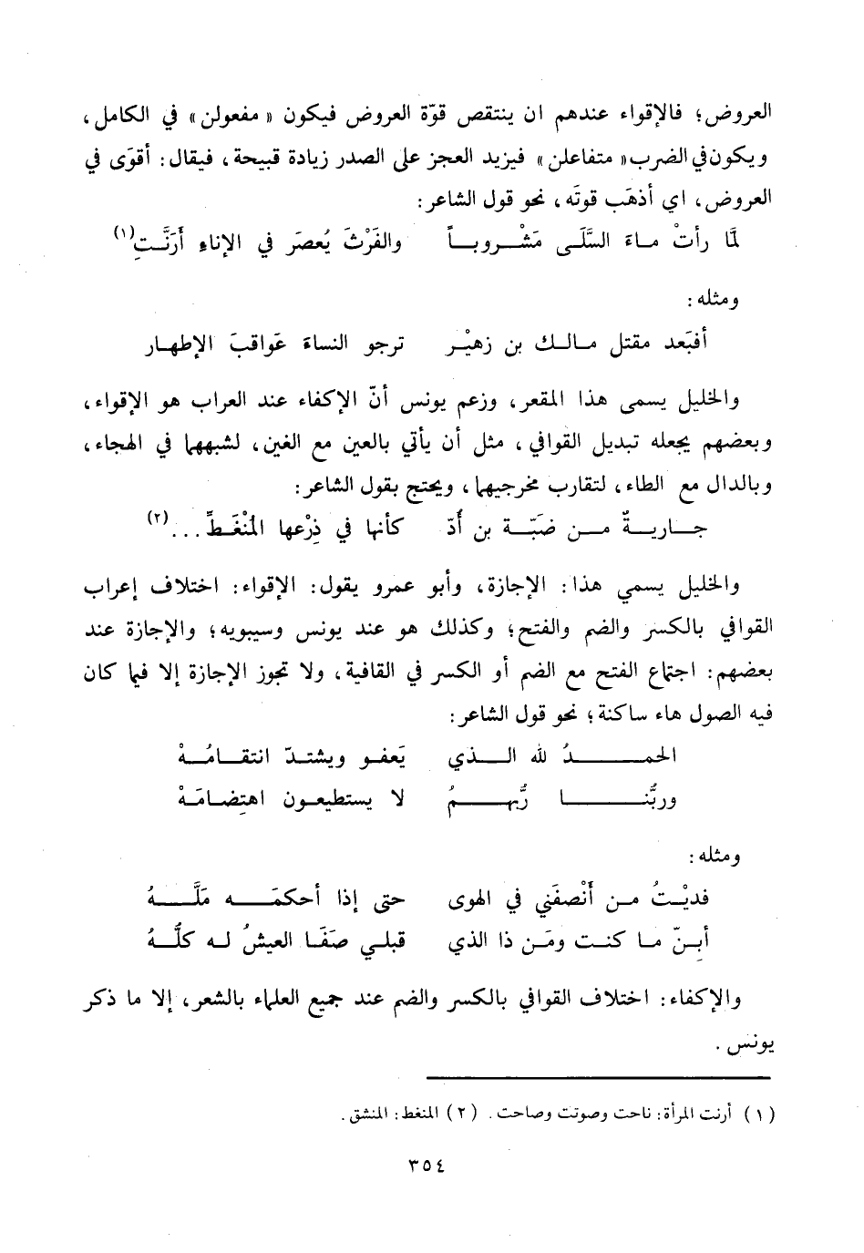 العروض، فالإقواء عندهم ان ينتقص قوّة العروض فيكون «مفعولن» في الكامل، ويكون في الضرب «متفاعلن» فيزيد العجز على الصدر زيادة قبيحة، فيقال: أقوى في العروض، اي أذهب قوته، نحو قول الشاعر: