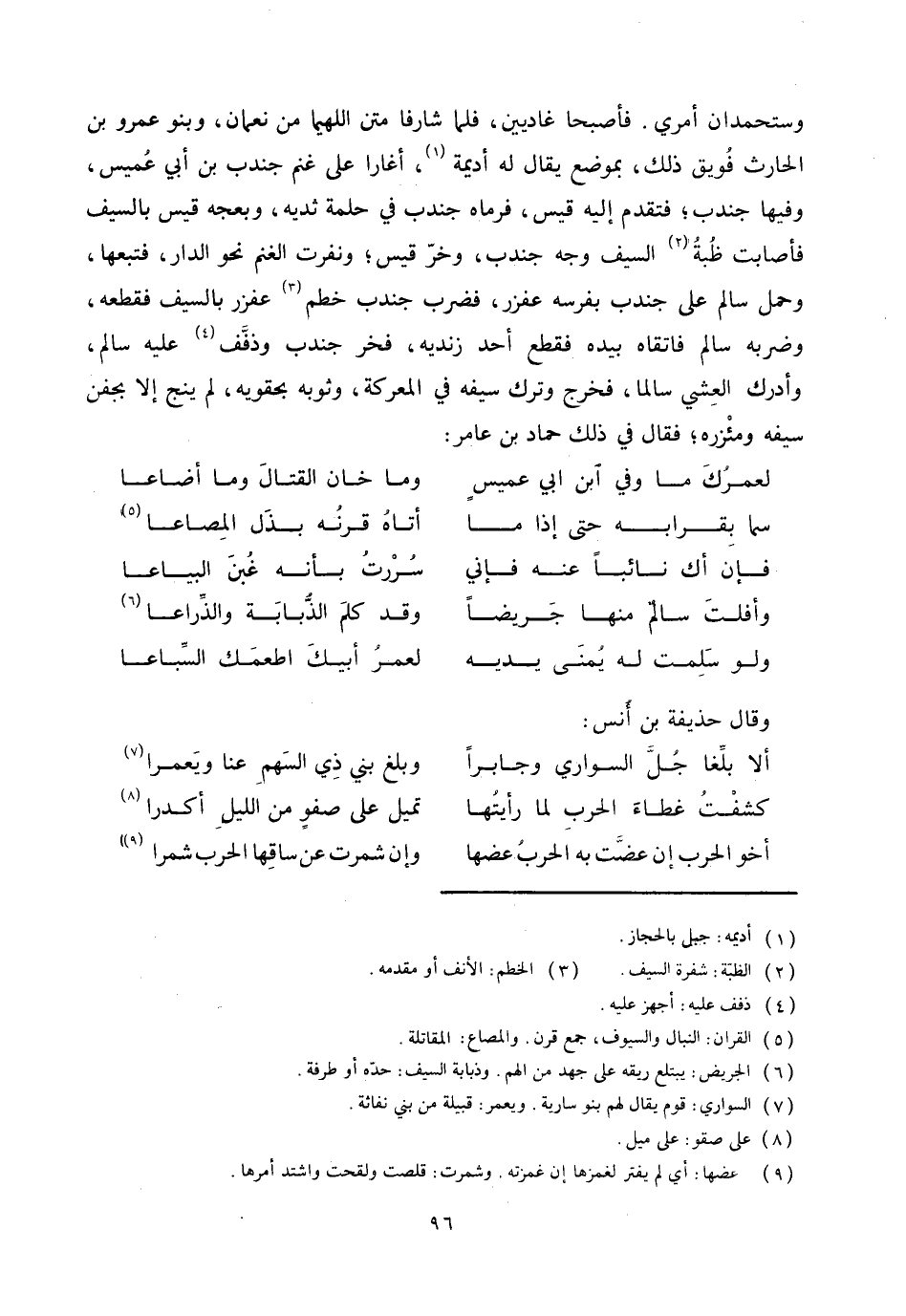 وستحمدان أمري. فأصبحا غاديين، فلما شارفا متن اللهيما من نعمان، وبنو عمرو بن الحارث فويق ذلك، بموضع يقال له أديمة «1» ، أغارا على غنم جندب بن أبي عميس، وفيها جندب، فتقدم إليه قيس، فرماه جندب في حلمة ثديه، وبعجه قيس بالسيف فأصابت ظبة «2» السيف وجه جندب، وخرّ قيس، ونفرت الغنم نحو الدار، فتبعها، وحمل سالم على جندب بفرسه عفزر، فضرب جندب خطم «3» عفزر بالسيف فقطعه، وضربه سالم فاتقاه بيده فقطع أحد زنديه، فخر جندب وذفّف «4» عليه سالم، وأدرك العشي سالما، فخرج وترك سيفه في المعركة، وثوبه بحقويه، لم ينج إلا بجفن سيفه ومئزره، فقال في ذلك حماد بن عامر:
