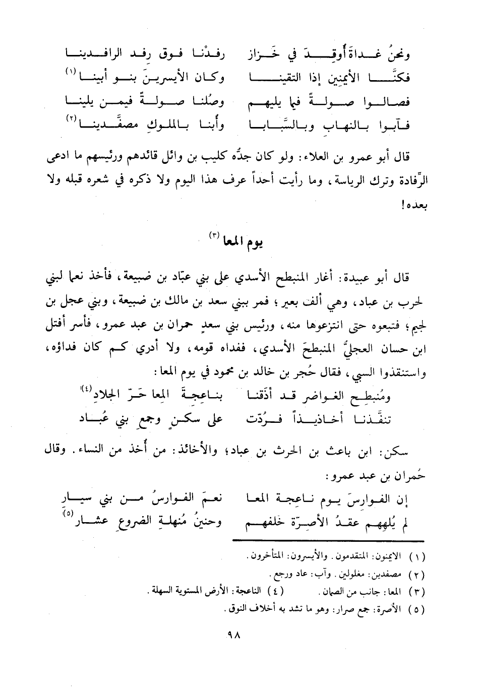 قال أبو عبيدة: أغار المنبطح الأسدي على بني عبّاد بن ضبيعة، فأخذ نعما لبني لحرب بن عباد، وهي ألف بعير، فمر ببني سعد بن مالك بن ضبيعة، وبني عجل بن لجيم، فتبعوه حتى انتزعوها منه، ورئيس بني سعد حمران بن عبد عمرو، فأسر أفتل ابن حسان العجليّ المنبطح الأسدي، ففداه قومه، ولا أدري كم كان فداؤه، واستنقذوا السبي، فقال حجر بن خالد بن محمود في يوم المعا:
