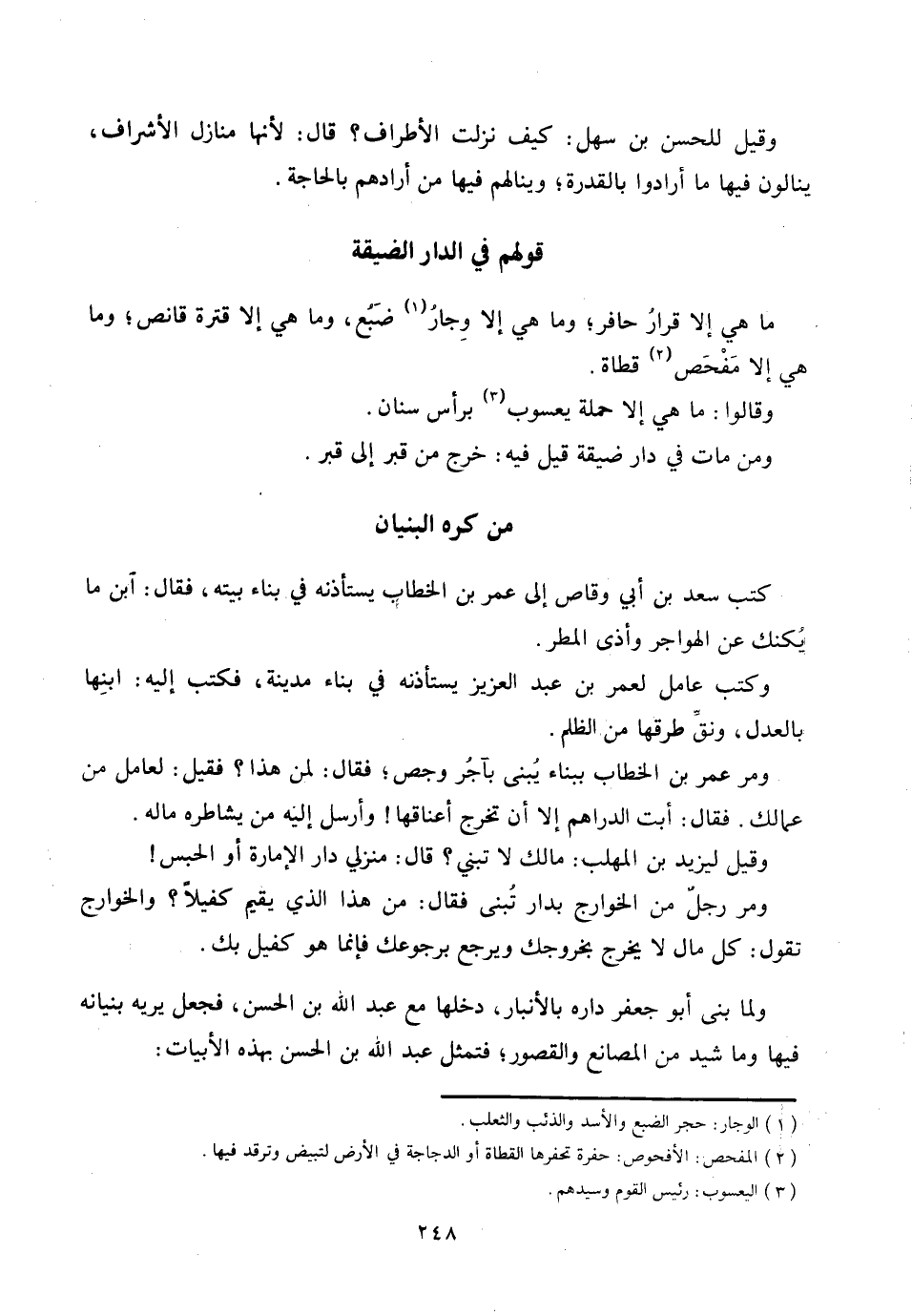 وقيل ليزيد بن المهلب: مالك لا تبني؟ قال: منزلي دار الإمارة أو الحبس! ومر رجل من الخوارج بدار تبنى فقال: من هذا الذي يقيم كفيلا؟ والخوارج تقول: كل مال لا يخرج بخروجك ويرجع برجوعك فإنما هو كفيل بك.