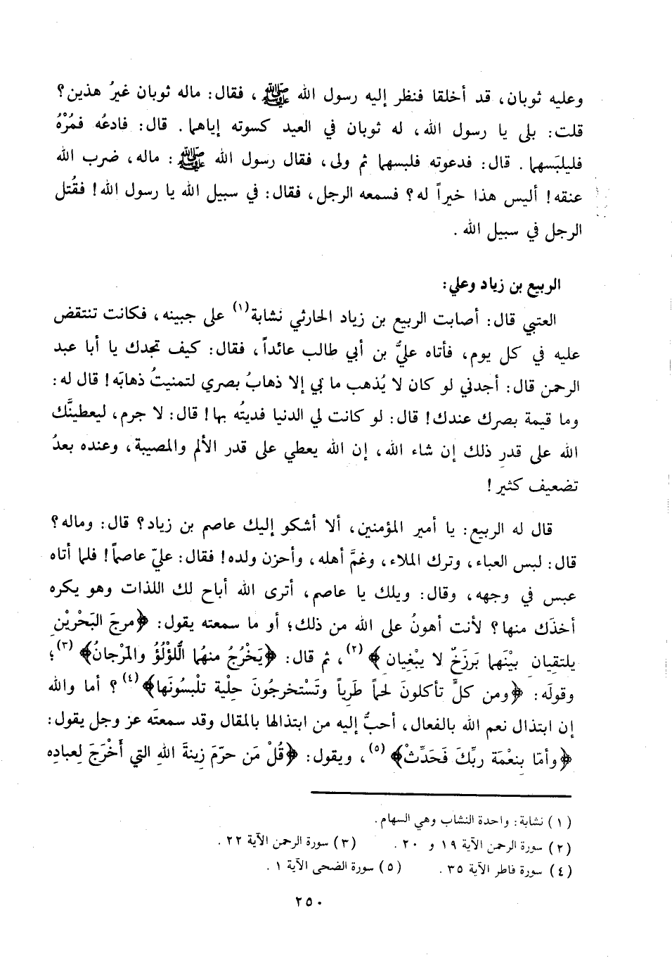 قلت: بلى يا رسول الله، له ثوبان في العيد كسوته إياهما. قال: فادعه فمره فليلبسهما. قال: فدعوته فلبسهما ثم ولى، فقال رسول الله صلّى الله عليه وسلّم: ماله، ضرب الله عنقه! أليس هذا خيرا له؟ فسمعه الرجل، فقال: في سبيل الله يا رسول الله! فقتل الرجل في سبيل الله.