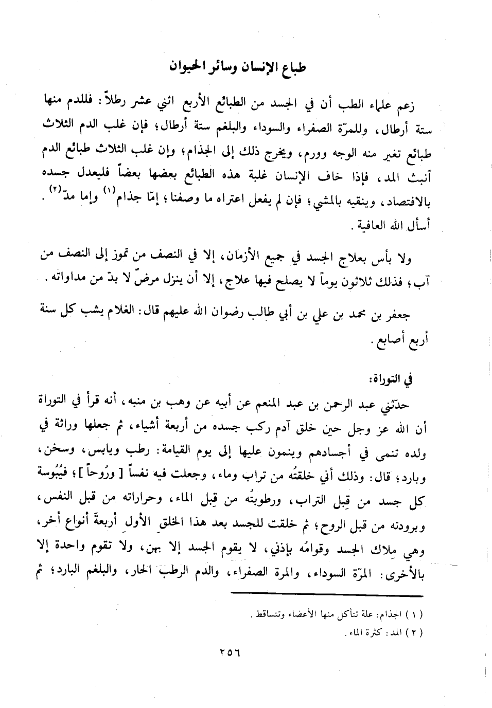 زعم علماء الطب أن في الجسد من الطبائع الأربع اثني عشر رطلا: فللدم منها ستة أرطال، وللمرّة الصفراء والسوداء والبلغم ستة أرطال؛ فإن غلب الدم الثلاث طبائع تغير منه الوجه وورم، ويخرج ذلك إلى الجذام؛ وإن غلب الثلاث طبائع الدم انبث المد، فإذا خاف الإنسان غلبة هذه الطبائع بعضها بعضا فليعدل جسده بالافتصاد، وينقيه بالمشي؛ فإن لم يفعل اعتراه ما وصفنا؛ إمّا جذام «1» وإما مدّ» .