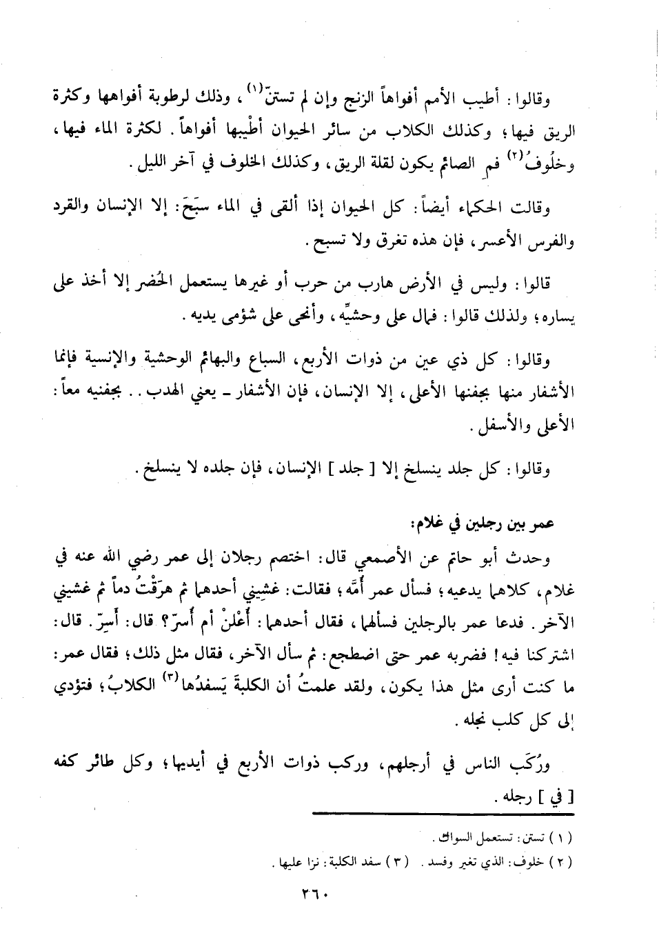وقالوا: أطيب الأمم أفواها الزنج وإن لم تستنّ «1» ، وذلك لرطوبة أفواهها وكثرة الريق فيها؛ وكذلك الكلاب من سائر الحيوان أطيبها أفواها. لكثرة الماء فيها، وخلوف «2» فم الصائم يكون لقلة الريق، وكذلك الخلوف في آخر الليل.