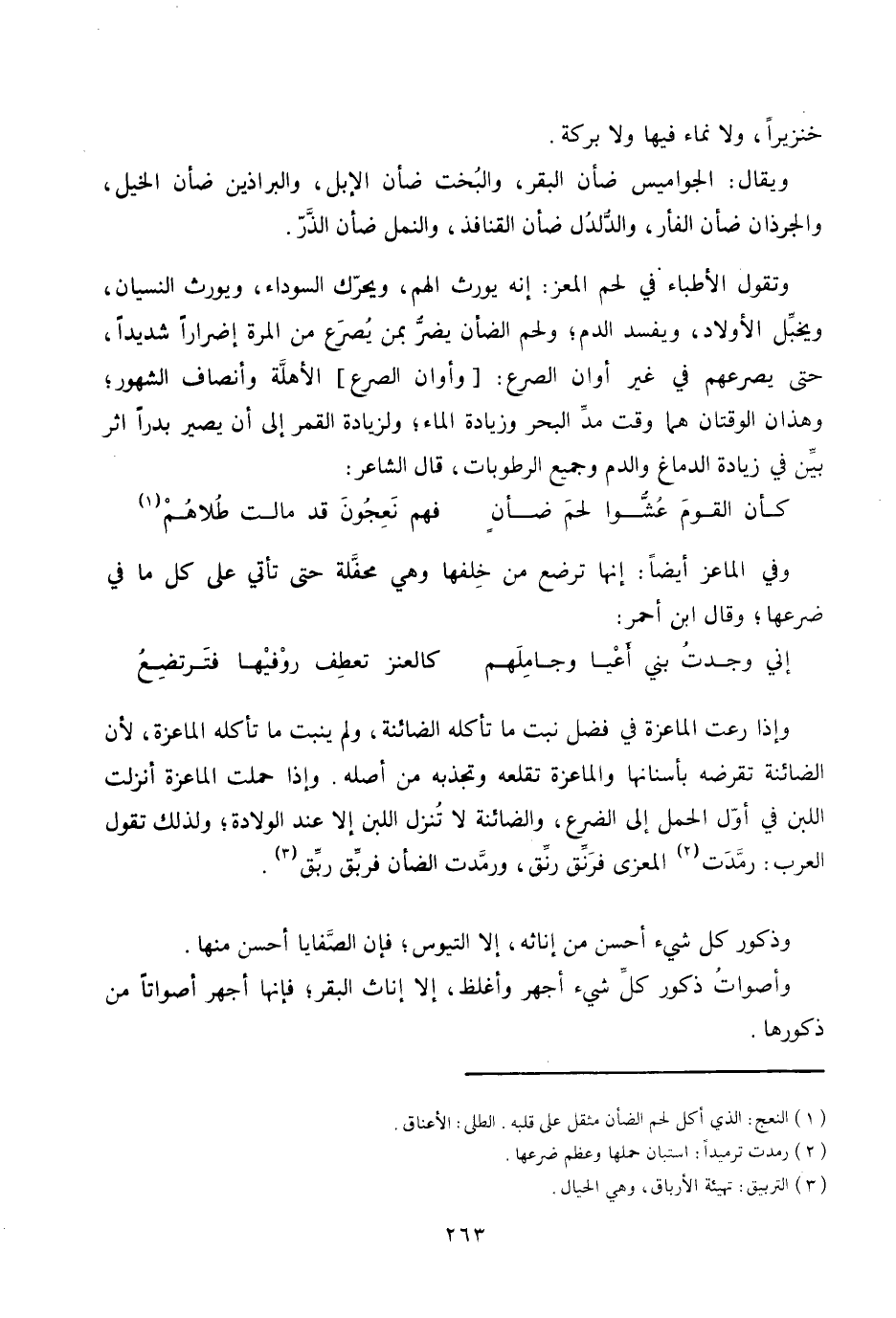 وتقول الأطباء في لحم المعز: إنه يورث الهم، ويحرّك السوداء، ويورث النسيان، ويخبّل الأولاد، ويفسد الدم؛ ولحم الضأن يضرّ بمن يصرع من المرة إضرارا شديدا، حتى يصرعهم في غير أوان الصرع: [وأوان الصرع] الأهلّة وأنصاف الشهور؛ وهذان الوقتان هما وقت مدّ البحر وزيادة الماء؛ ولزيادة القمر إلى أن يصير بدرا اثر بيّن في زيادة الدماغ والدم وجميع الرطوبات، قال الشاعر: