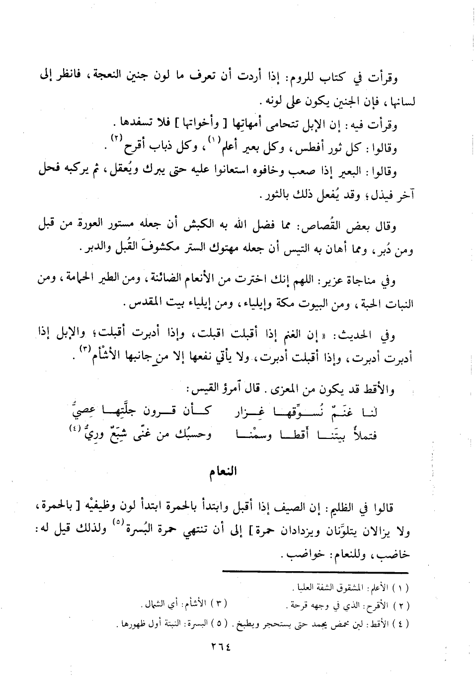 وقرأت في كتاب للروم: إذا أردت أن تعرف ما لون جنين النعجة، فانظر إلى لسانها، فإن الجنين يكون على لونه.