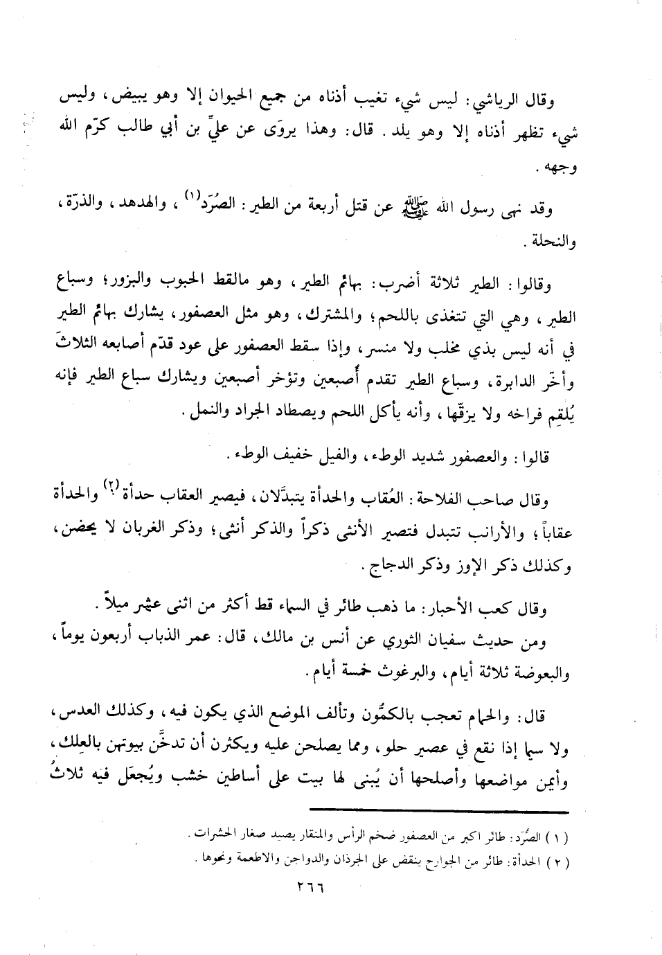 وقال الرياشي: ليس شيء تغيب أذناه من جميع الحيوان إلا وهو يبيض، وليس شيء تظهر أذناه إلا وهو يلد. قال: وهذا يروى عن عليّ بن أبي طالب كرّم الله وجهه.