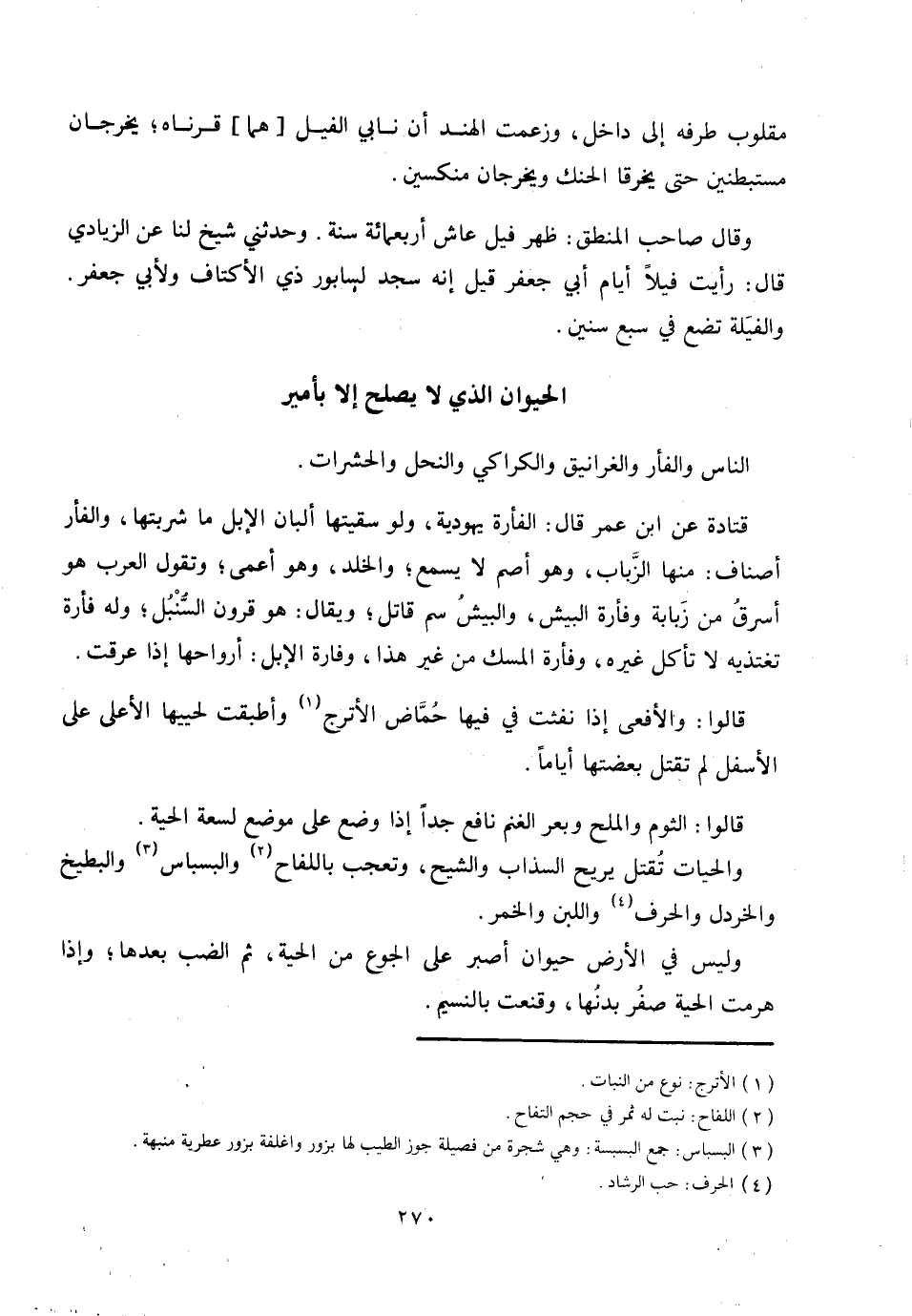 وقال صاحب المنطق: ظهر فيل عاش أربعمائة سنة. وحدثني شيخ لنا عن الزيادي قال: رأيت فيلا أيام أبي جعفر قيل إنه سجد لسابور ذي الأكتاف ولأبي جعفر.