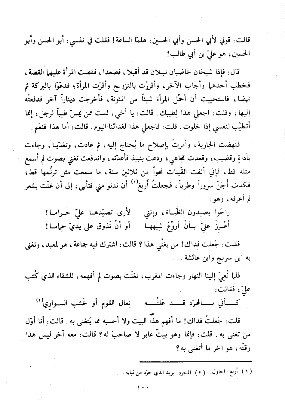 قلت: جعلت فداك! ما أفهم هذا البيت ولا أحسبه مما يتغنى به. قالت: أنا أوّل من تغنى به. قلت: فإنما وهو بيت عابر لا صاحب له؟ قالت: معه آخر ليس هذا وقته، هو آخر ما أتغنى به؟