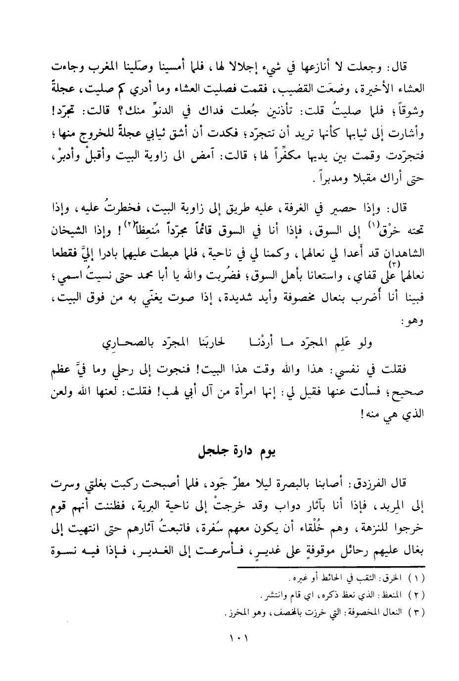 قال الفرزدق: أصابنا بالبصرة ليلا مطر جود، فلما أصبحت ركبت بغلتي وسرت إلى المربد، فإذا أنا بآثار دواب وقد خرجت إلى ناحية البرية، فظننت أنهم قوم خرجوا للنزهة، وهم خلقاء أن يكون معهم سفرة، فاتبعت آثارهم حتى انتهيت إلى بغال عليهم رحائل موقوفة على غدير، فأسرعت إلى الغدير، فإذا فيه نسوة