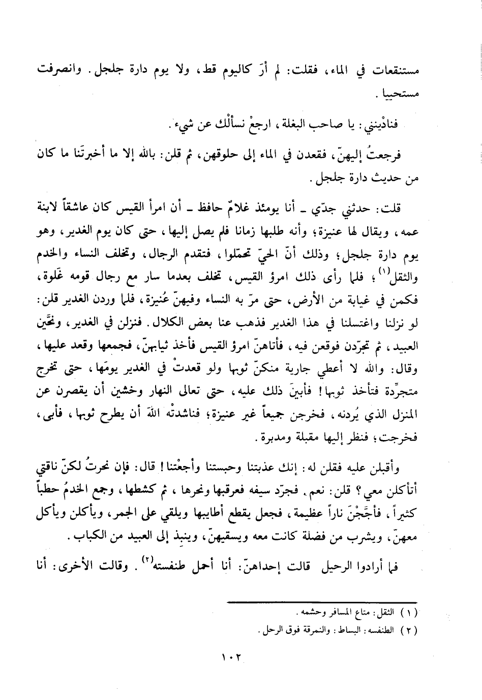 وأقبلن عليه فقلن له: إنك عذبتنا وحبستنا وأجعتنا! قال: فإن نحرت لكنّ ناقتي أتأكلن معي؟ قلن: نعم، فجرّد سيفه فعرقبها ونحرها، ثم كشطها، وجمع الخدم حطبا كثيرا، فأجّجن نارا عظيمة، فجعل يقطع أطايبها ويلقي على الجمر، ويأكلن ويأكل معهنّ، ويشرب من فضلة كانت معه ويسقيهنّ، وينبذ إلى العبيد من الكباب.