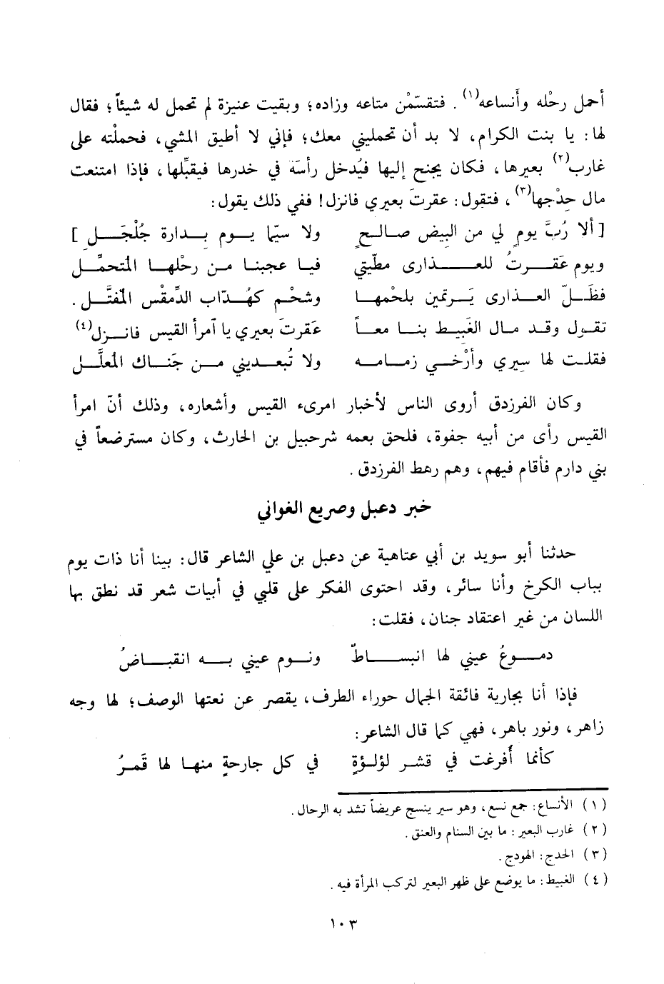 . فتقسّمن متاعه وزاده؛ وبقيت عنيزة لم تحمل له شيئا؛ فقال لها: يا بنت الكرام، لا بد أن تحمليني معك؛ فإني لا أطيق المشي، فحملته على غارب «2» بعيرها، فكان يجنح إليها فيدخل رأسة في خدرها فيقبّلها، فإذا امتنعت مال حدجها «3» ، فتقول: عقرت بعيري فانزل! ففي ذلك يقول: