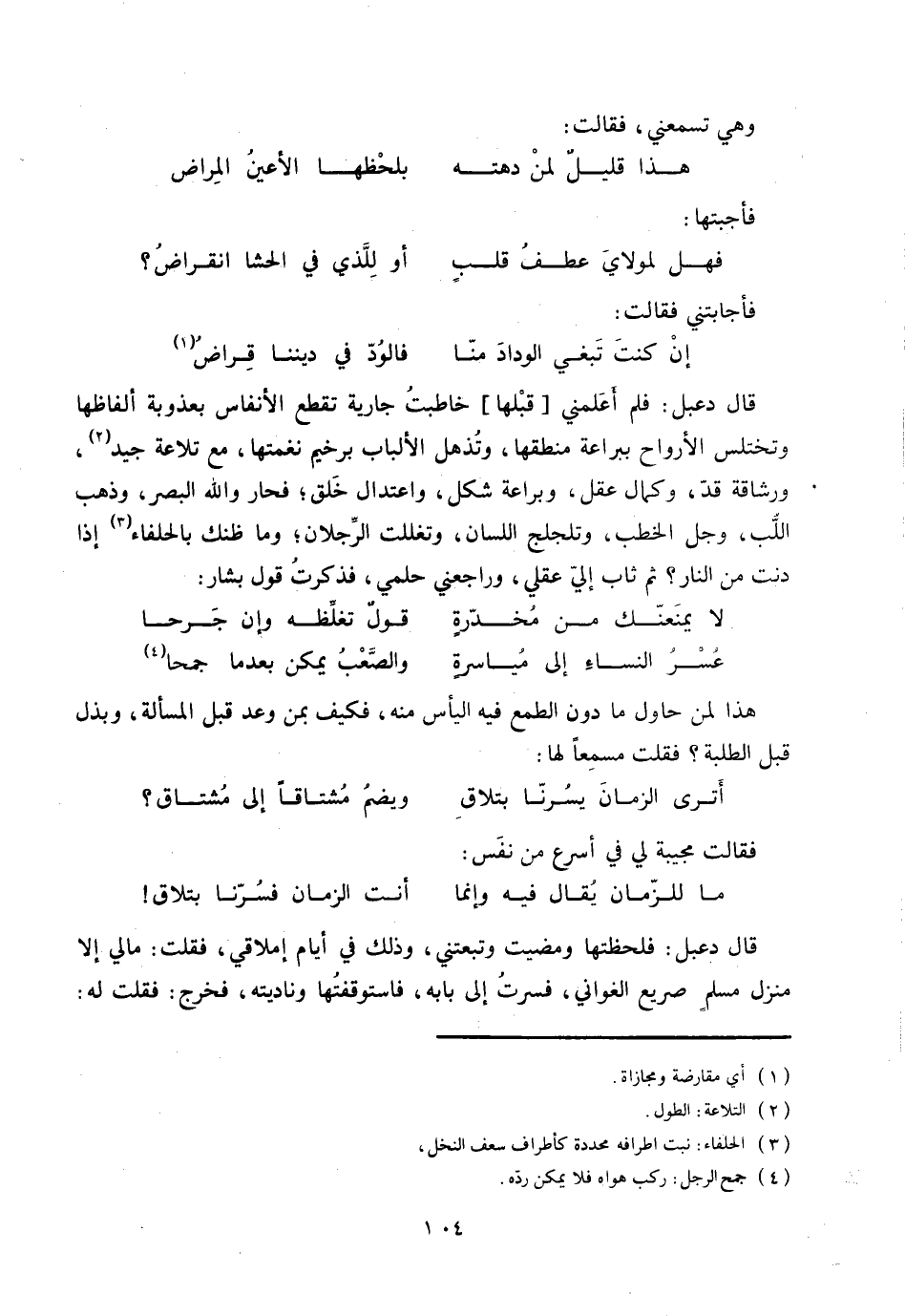قال دعبل: فلم أعلمني [قبلها] خاطبت جارية تقطع الأنفاس بعذوبة ألفاظها وتختلس الأرواح ببراعة منطقها، وتذهل الألباب برخيم نغمتها، مع تلاعة جيد «2» ، ورشاقة قدّ، وكمال عقل، وبراعة شكل، واعتدال خلق؛ فحار واللَّه البصر، وذهب اللّب، وجل الخطب، وتلجلج اللسان، وتغللت الرّجلان؛ وما ظنك بالحلفاء «3» إذا دنت من النار؟ ثم ثاب إليّ عقلي، وراجعني حلمي، فذكرت قول بشار: