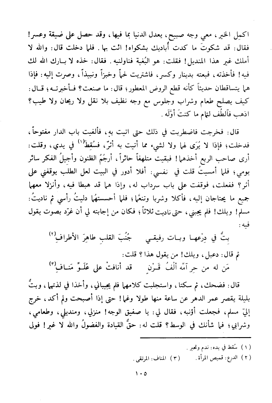 قال: فضحك، ثم سكتا، واستجلبت كلامهما فلم يجيباني، وأخذا في لذتهما، وبتّ بليلة يقصر عمر الدهر عن ساعة منها طولا وغما! حتى إذا أصبحت ولم أكد، خرج إليّ مسلم، فجعلت أؤنبه، فقال لي: يا صفيق الوجه! منزلي، ومنديلي، وطعامي، وشرابي؛ فما شأنك في الوسط؟ قلت له: حقّ القيادة والفضول واللَّه لا غير! فولى