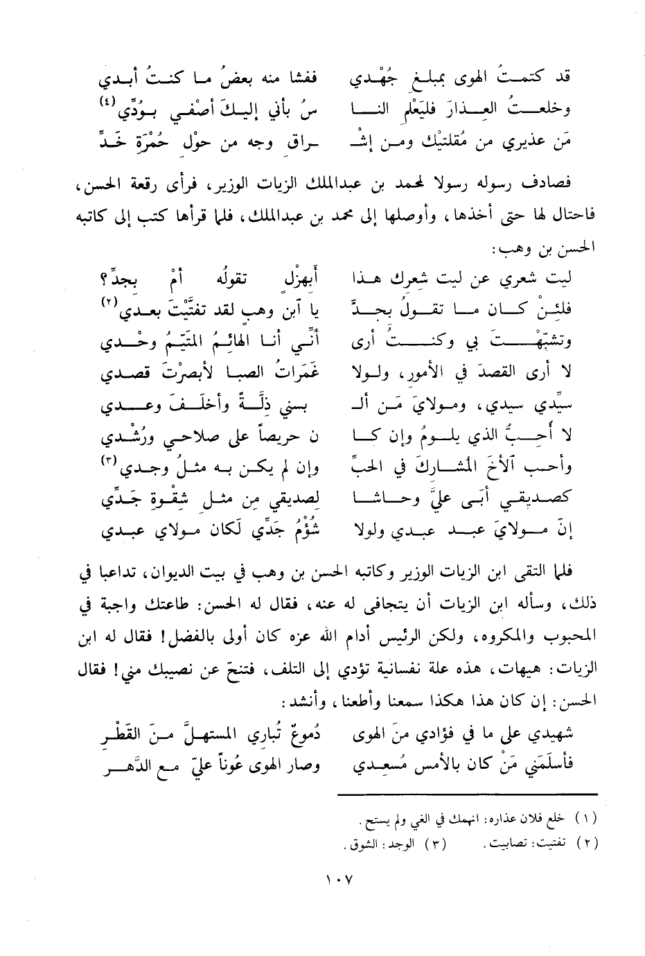 فلما التقى ابن الزيات الوزير وكاتبه الحسن بن وهب في بيت الديوان، تداعبا في ذلك، وسأله ابن الزيات أن يتجافى له عنه، فقال له الحسن: طاعتك واجبة في المحبوب والمكروه، ولكن الرئيس أدام اللَّه عزه كان أولى بالفضل! فقال له ابن الزيات: هيهات، هذه علة نفسانية تؤدي إلى التلف، فتنحّ عن نصيبك مني! فقال الحسن: إن كان هذا هكذا سمعنا وأطعنا، وأنشد: