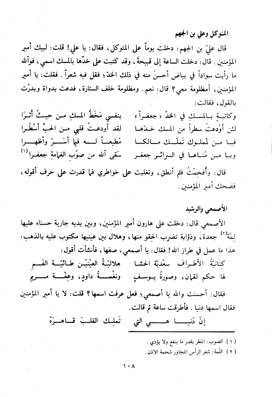 الأصمعي قال: دخلت على هارون أمير المؤمنين، وبين يديه جارية حسناء عليها لمّة «2» جعدة، وذؤابة تضرب الحقو منها، وهلال بين عينيها مكتوب عليه بالذهب: