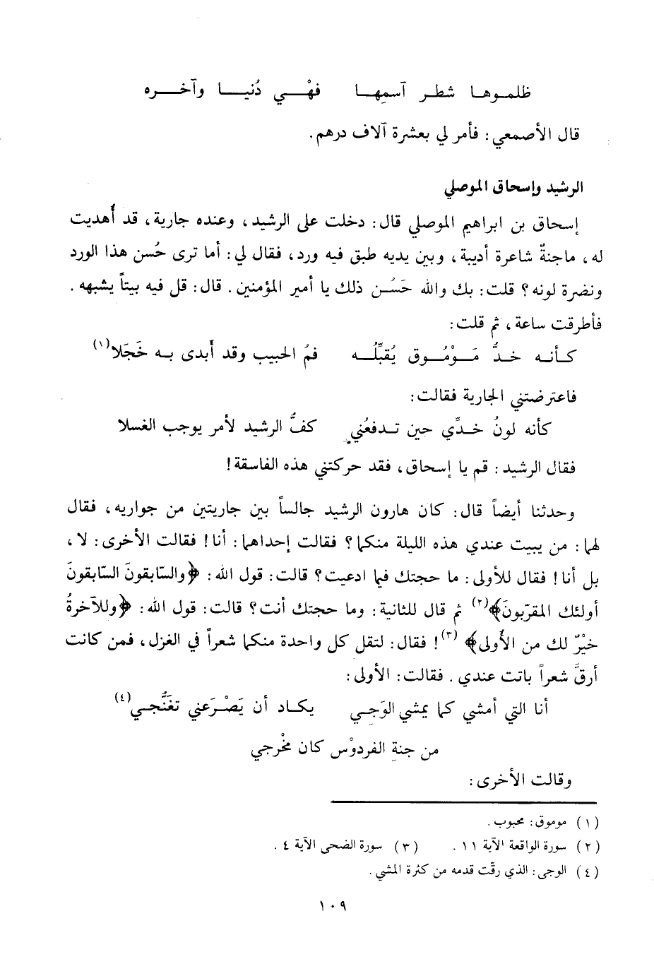 فقال الرشيد: قم يا إسحاق، فقد حركتني هذه الفاسقة! وحدثنا أيضا قال: كان هارون الرشيد جالسا بين جاريتين من جواريه، فقال لهما: من يبيت عندي هذه الليلة منكما؟ فقالت إحداهما: أنا! فقالت الأخرى: لا، بل أنا! فقال للأولى: ما حجتك فيما ادعيت؟ قالت: قول اللَّه: وَالسَّابِقُونَ السَّابِقُونَ أُولئِكَ الْمُقَرَّبُونَ