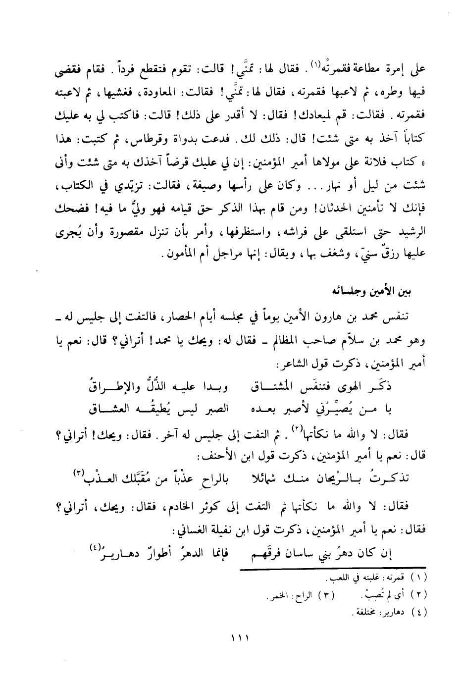على إمرة مطاعة فقمرته «1» . فقال لها: تمنّي! قالت: تقوم فتقطع فردا. فقام فقضى فيها وطره، ثم لاعبها فقمرته، فقال لها: تمنّي! فقالت: المعاودة فغشيها، ثم لاعبته فقمرته. فقالت: قم لميعادك! فقال: لا أقدر على ذلك! قالت: فاكتب لي به عليك كتابا آخذ به متى شئت! قال: ذلك لك. فدعت بدواة وقرطاس، ثم كتبت: هذا «كتاب فلانة على مولاها أمير المؤمنين: إن لي عليك قرضا آخذك به متى شئت وأنى شئت من ليل أو نهار ... وكان على رأسها وصيفة، فقالت: تزيّدي في الكتاب، فإنك لا تأمنين الحدثان! ومن قام بهذا الذكر حق قيامه فهو وليّ ما فيه! فضحك الرشيد حتى استلقى على فراشه، واستظرفها، وأمر بأن تنزل مقصورة وأن يجرى عليها رزق سنيّ، وشغف بها، ويقال: إنها مراجل أم المأمون.