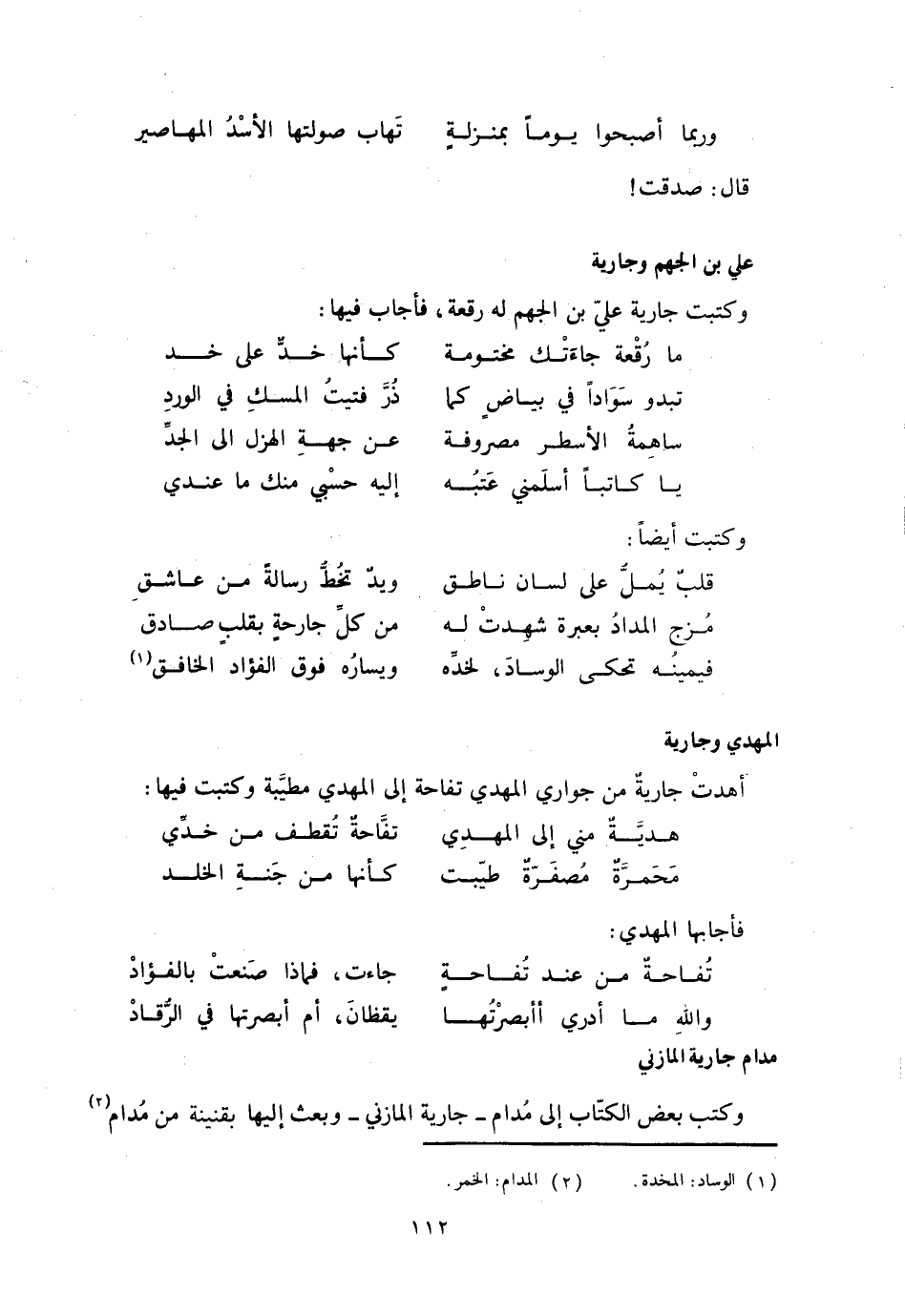 وكتب بعض الكتّاب إلى مدام- جارية المازني- وبعث إليها بقنينة من مدام «2»