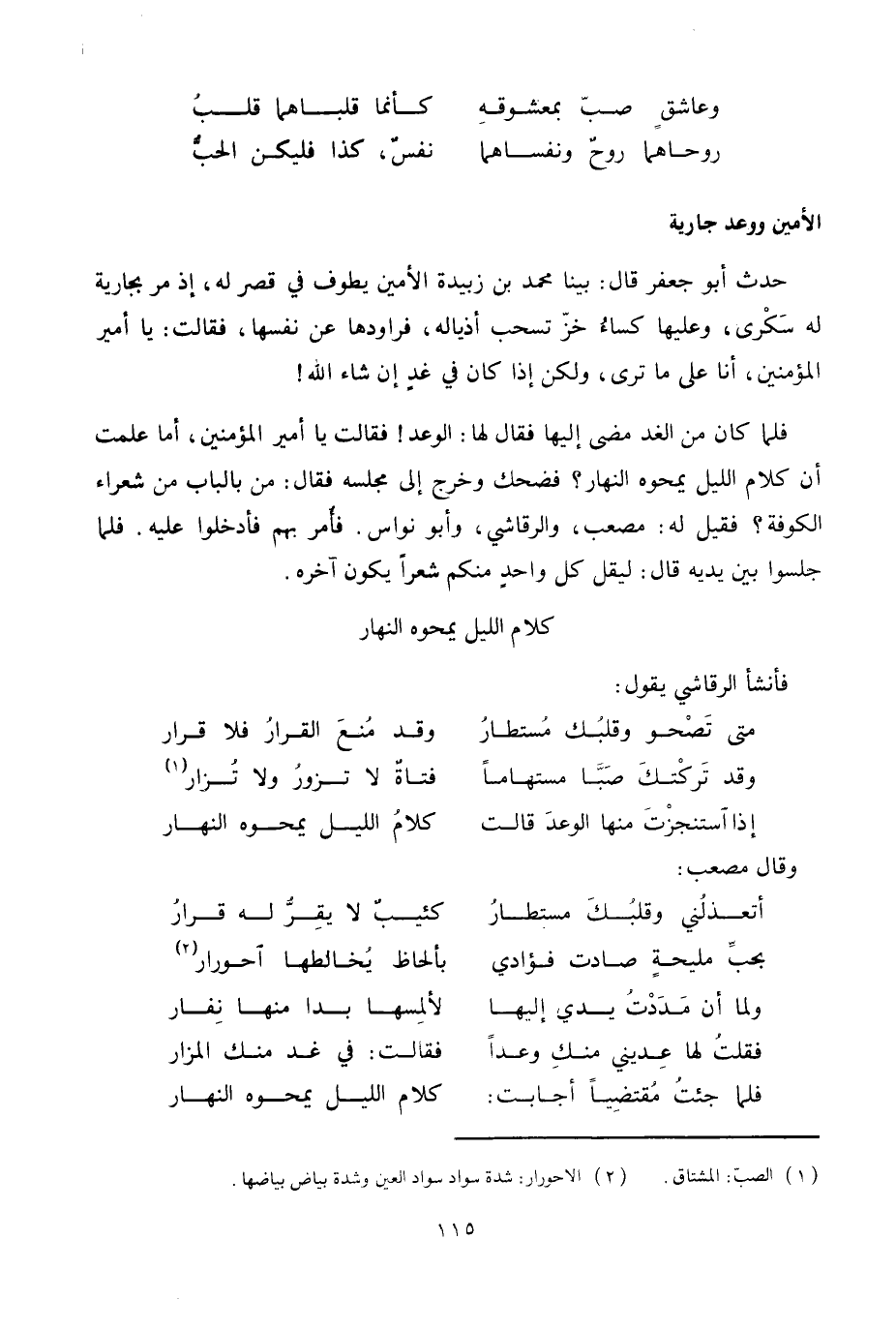 حدث أبو جعفر قال: بينا محمد بن زبيدة الأمين يطوف في قصر له، إذ مر بجارية له سكرى، وعليها كساء خزّ تسحب أذياله، فراودها عن نفسها، فقالت: يا أمير المؤمنين، أنا على ما ترى، ولكن إذا كان في غد إن شاء اللَّه! فلما كان من الغد مضى إليها فقال لها: الوعد! فقالت يا أمير المؤمنين، أما علمت أن كلام الليل يمحوه النهار؟ فضحك وخرج إلى مجلسه فقال: من بالباب من شعراء الكوفة؟ فقيل له: مصعب، والرقاشي، وأبو نواس. فأمر بهم فأدخلوا عليه. فلما جلسوا بين يديه قال: ليقل كل واحد منكم شعرا يكون آخره.