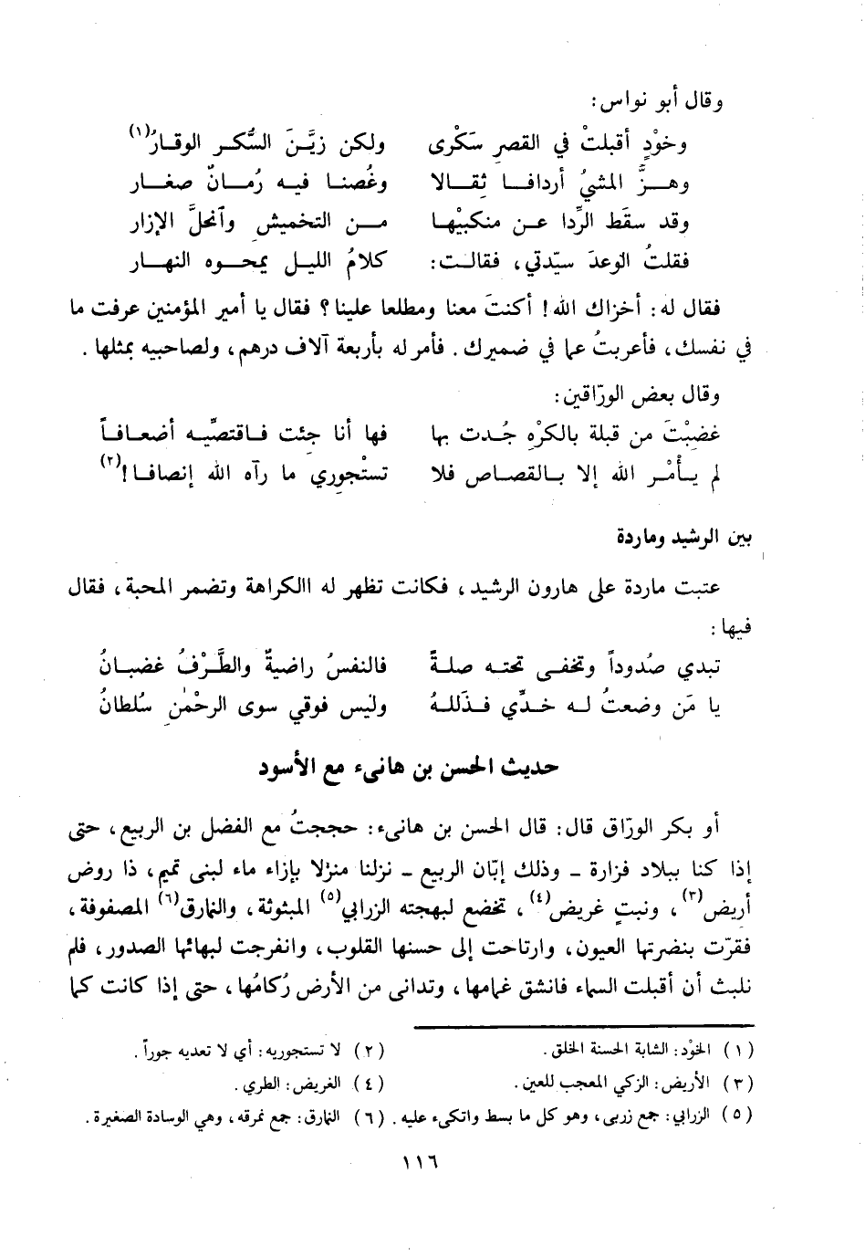 أو بكر الورّاق قال: قال الحسن بن هانىء: حججت مع الفضل بن الربيع، حتى إذا كنا ببلاد فزارة- وذلك إبّان الربيع- نزلنا منزلا بإزاء ماء لبنى تميم، ذا روض أريض «3» ، ونبت غريض «4» ، تخضع لبهجته الزرابي «5» المبثوثة، والنمارق «6» المصفوفة، فقرّت بنضرتها العيون، وارتاحت إلى حسنها القلوب، وانفرجت لبهائها الصدور، فلم نلبث أن أقبلت السماء فانشق غمامها، وتدانى من الأرض ركامها، حتى إذا كانت كما