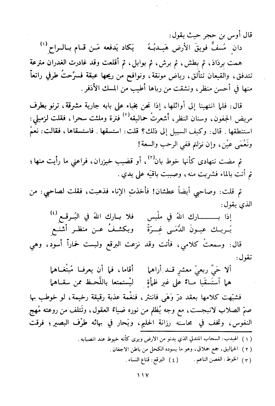 استنطقها. قال: وكيف السبيل إلى ذلك؟ قلت: استسقها. فاستسقاها، فقالت: نعم ونعمى عين، وإن نزلتم ففي الرحب والسعة! ثم مضت تتهادى كأنها خوط بان «3» ، أو قضيب خيزران، فراعني ما رأيت منها؛ ثم أتت بالماء فشربت منه، وصببت باقيه على يدي.
