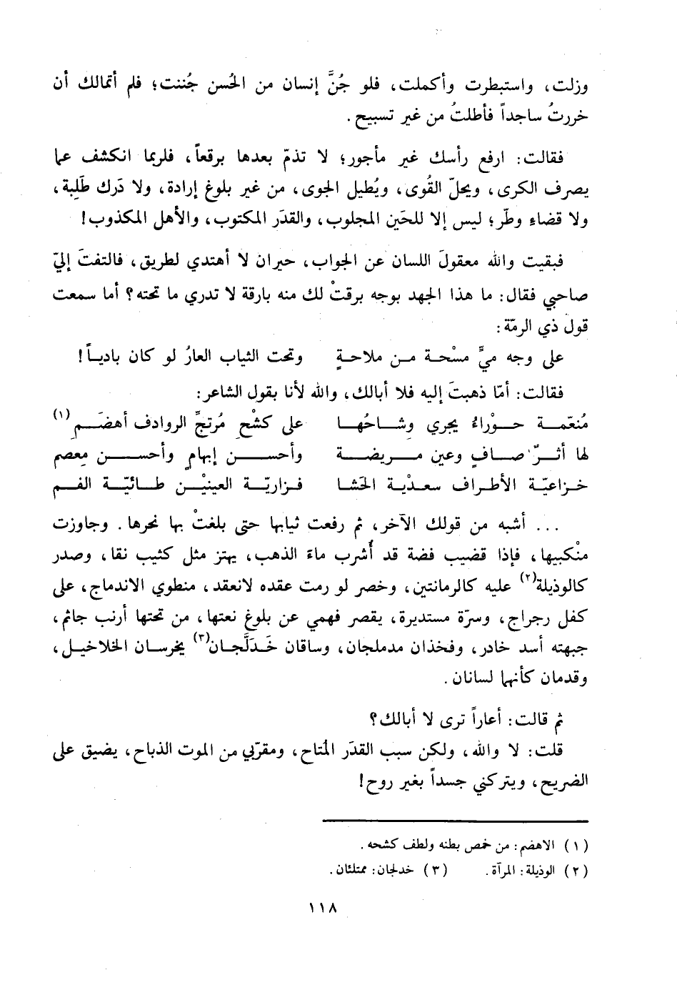 فقالت: ارفع رأسك غير مأجور؛ لا تذمّ بعدها برقعا، فلربما انكشف عما يصرف الكرى، ويحلّ القوى، ويطيل الجوى، من غير بلوغ إرادة، ولا درك طلبة، ولا قضاء وطّر؛ ليس إلا للحين المجلوب، والقدر المكتوب، والأهل المكذوب! فبقيت واللَّه معقول اللسان عن الجواب، حيران لا أهتدي لطريق، فالتفت إليّ صاحبي فقال: ما هذا الجهد بوجه برقت لك منه بارقة لا تدري ما تحته؟ أما سمعت قول ذي الرمّة: