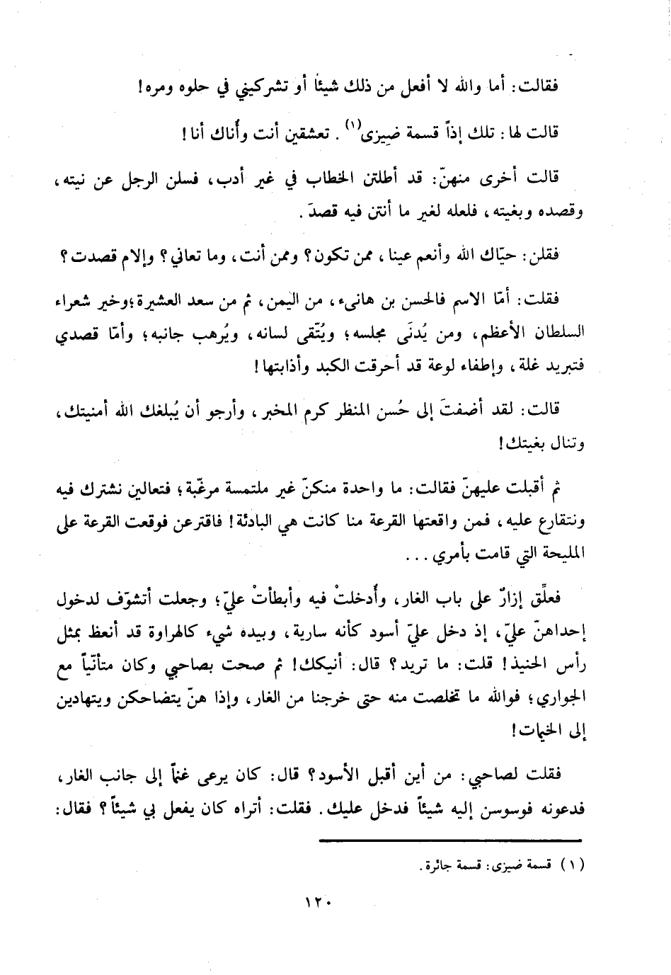 فقلت: أمّا الاسم فالحسن بن هانىء، من اليمن، ثم من سعد العشيرة؛ وخير شعراء السلطان الأعظم، ومن يدنى مجلسه؛ ويتّقى لسانه، ويرهب جانبه؛ وأمّا قصدي فتبريد غلة، وإطفاء لوعة قد أحرقت الكبد وأذابتها! قالت: لقد أضفت إلى حسن المنظر كرم المخبر، وأرجو أن يبلغك اللَّه أمنيتك، وتنال بغيتك! ثم أقبلت عليهنّ فقالت: ما واحدة منكنّ غير ملتمسة مرغّبة؛ فتعالين نشترك فيه ونتقارع عليه، فمن واقعتها القرعة منا كانت هي البادئة! فاقترعن فوقعت القرعة على المليحة التي قامت بأمري ...