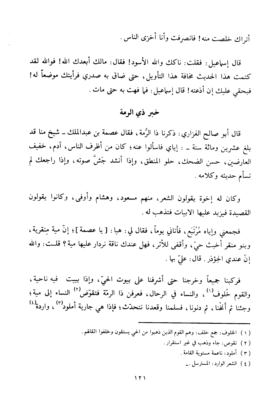 فركبنا جميعا وخرجنا حتى أشرفنا على بيوت الحيّ، وإذا ببيت فيه ناحية، والقوم خلوف «1» ، والنساء في الرحال، فعرفن ذا الرمّة فتقوّض «2» النساء إلى مية؛ وجئنا ثم أنخنا، ثم دنونا، فسلمنا وقعدنا نتحدّث؛ فإذا هي جارية أملود «3» ، واردة «4»