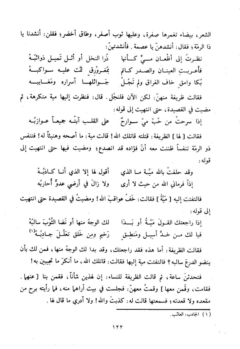 فقالت ظريفة منهنّ: لكن الآن فلنجل. قال: فنظرت إليها مية متكرهة، ثم مضيت في القصيدة، حتى انتهيت إلى قوله: